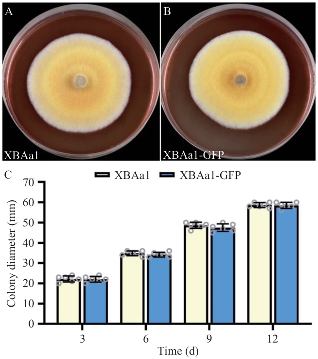 Fig. 7 Colony characteristics of tagged strain XBAa1-GFP and wild type strain XBAa1A: Wild type XBAa1. B: XBAa1-GFP strain. C: Growth rates of strains