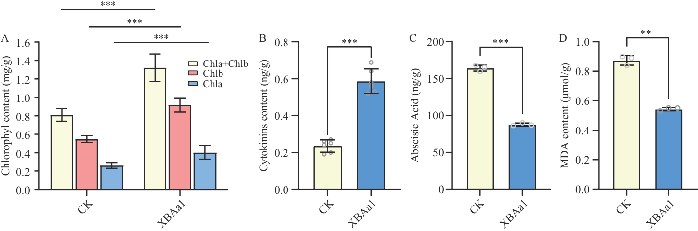 图3 菌株XBAa1对烟草叶绿素、细胞分裂素、脱落酸及丙二醛含量的影响A:叶绿素; B:细胞分裂素; C:脱落酸; D:丙二醛