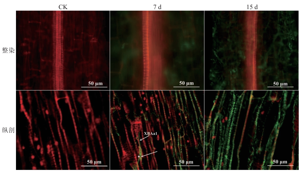 目的 明确金色毛壳菌(Arcopilus aureus)XBAa1对烟草的促生作用及其在根内的定殖动态规律。 方法 通过重建烟草-XBAa1共生体,验证菌株的内生性并测定其促生作用;采用聚乙二醇(PEG)介导制备XBAa1原生质体,将携带绿色荧光蛋白(GFP)基因的P3641质粒整合至菌株基因组,获得稳定表达GFP的转化子;通过转化子侵染烟草根系,结合激光共聚焦显微镜和绝对荧光定量PCR法检测XBAa1菌株侵染部位及其在烟草根内的定殖量变化。 结果 XBAa1可内生定殖于烟草根内,显著促进烟草生长;地上部及根系生物量明显增加,叶片叶绿素a+b含量较对照组提升63.17%;调控烟草内源激素水平,细胞分裂素和脱落酸含量分别较对照组增加143.65%和降低46.56%;同时降低烟草氧化损伤程度,丙二醛含量较对照组下降38.02%。XBAa1原生质体制备细胞壁最佳裂解条件为12.5 mg/mL Megalyase酶解液酶解3 h;获得GFP标记的XBAa1-Y3转化子稳定定殖于烟草根组织细胞间隙。温室无菌基质条件下,接种30 d内,XBAa1菌株在烟草根内的定殖量呈“先升后降”趋势,接种15 d时达到峰值(1.23×107 copies/mL);30 d时,定殖量降至8.12×106 copies/mL。 结论 金色毛壳菌XBAa1能在烟草根内稳定定殖,显著促进烟草生长,在农业上具有一定的应用潜力;获得的GFP遗传转化子表明原生质体可作为后续遗传转化材料,为深入理解XBAa1在烟草体内迁移及其生防功能奠定研究基础。