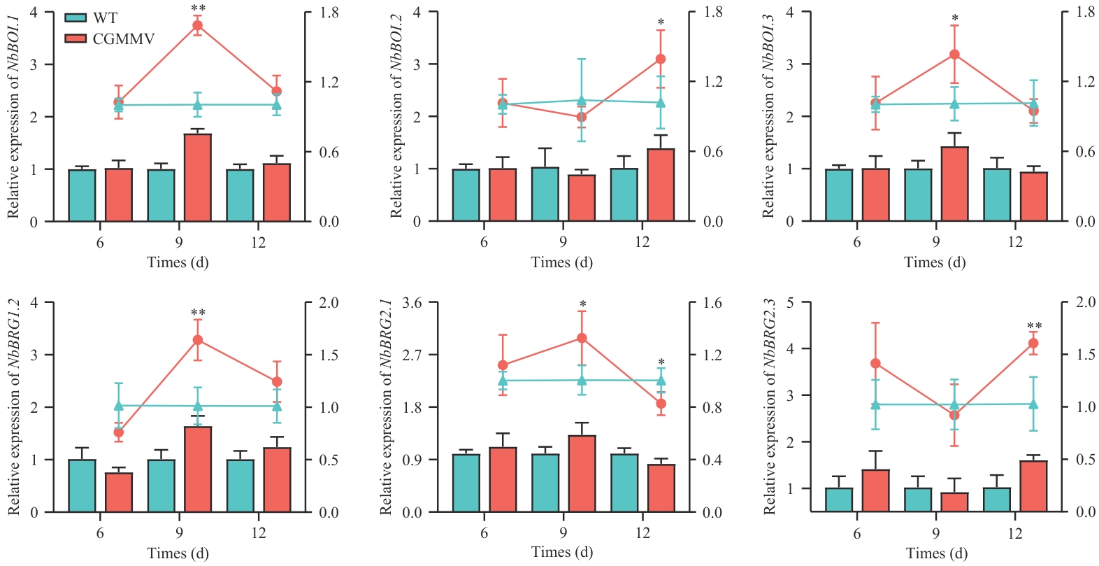 目的 明确RING型泛素E3连接酶灰霉病易感互作因子(botrytis susceptible1 interactor, BOI)在赤霉素信号传导和黄瓜绿斑驳花叶病毒(cucumber green mottle mosaic virus, CGMMV)侵染过程中的作用及其基因家族特征,为理解茄科作物抗病毒分子机制及化学调控提供理论依据。 方法 通过生物信息学对本氏烟BOI基因家族进行系统进化关系、基因结构、保守基序、启动子顺式作用元件、转录因子及组织表达特征进行分析,利用荧光定量PCR验证NbBOI家族成员在生物胁迫和激素处理下的表达变化,并通过酵母双杂交试验筛选出与CGMMV编码蛋白互作的BOI家族基因。 结果 本氏烟BOI基因家族有13个成员,可划分为4个亚家族;同一进化分支的BOI家族成员的Motif及基因结构具有高度的一致性;启动子顺式作用元件预测筛选到6个与赤霉素通路相关基因;通过荧光定量PCR检测发现,NbBOI家族成员在组织特异性表达模式上存在差异,并且对病毒侵染和赤霉素处理的响应模式不同;酵母双杂交验证了NbBRG2.1与CGMMV编码的外壳蛋白CP、运动蛋白MP相互作用。 结论 本氏烟BOI基因家族具有高度的保守性,参与植物的生物胁迫防御和激素信号传导,其中NbBRG1.2在赤霉素合成途径中起重要作用,NbBOI.1NbBOI.2NbBOI.3NbBRG1.2NbBRG2.1NbBRG2.3在植物对CGMMV侵染的防御机制中起一定作用。在病毒侵染过程中,通过病毒蛋白劫持寄主内NbBRG2.1,从而破坏寄主内激素平衡。
