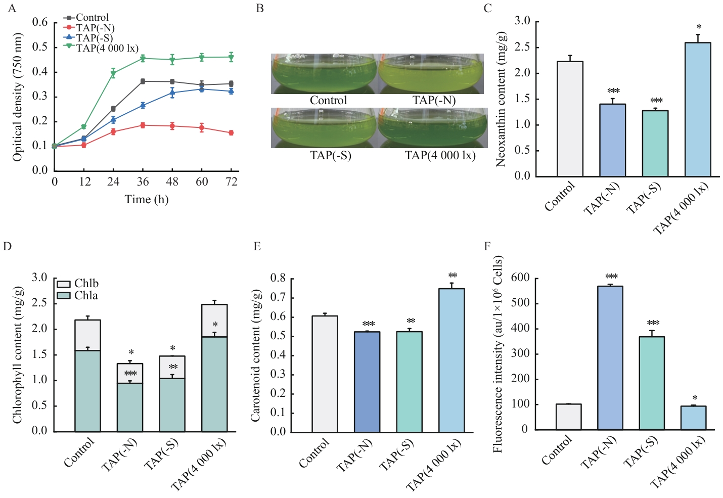 Fig. 1 Effects of culture conditions on the growth and pigment biosynthesis in C. reinhardtiiA: Growth curves. B: Culture status at mid-logarithmic phase. C: Neoxanthin content. D: Chlorophyll content. E: Carotenoid content. F: Lipid content. The values in the bar charts are of the mean±standard error (n=3); *, **, *** indicate P<0.05, P<0.01, P<0.001, respectively, the same below
