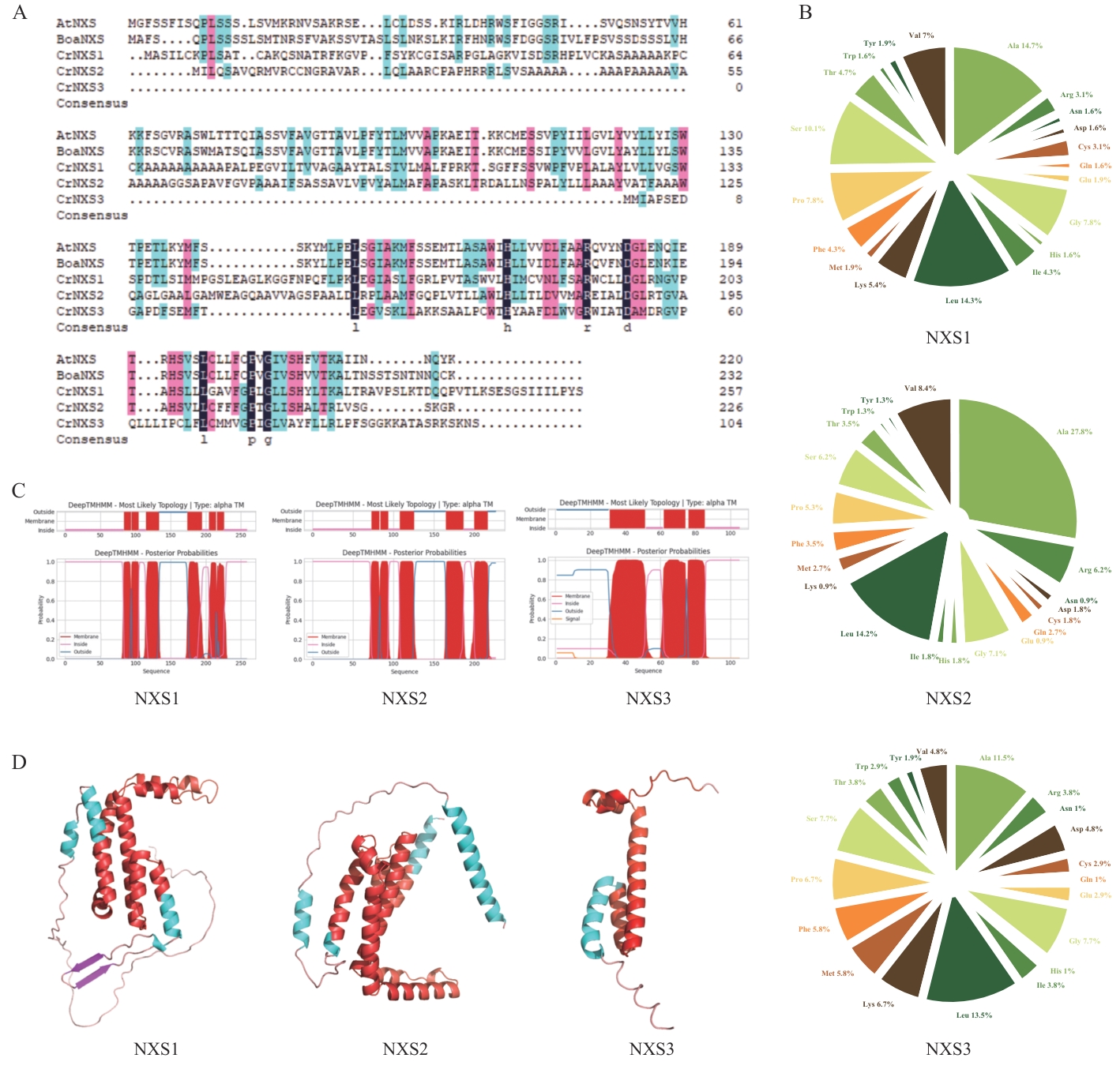 Fig. 2 Bioinformatics analysis of proteins associated with neoxanthin synthesisA: Amino acid sequence alignment of three candidate proteins in C. reinhardtii with the identified neoxanthin synthase in literature;AtNXS (neoxanthin synthase in A. thaliana), BoaNXS (neoxanthin synthase in Brassica oleracea var. acephala), CrNXS1-3 (neoxanthin synthase in C. reinhardtii). The conserved DUF4281 domain is boxed in red. B: Amino acid composition. C: Prediction analysis of transmembrane domain. D: The predicted tertiary structure is depicted as α-helices (green), β-sheets (pink), and the DUF4281 domain (red)