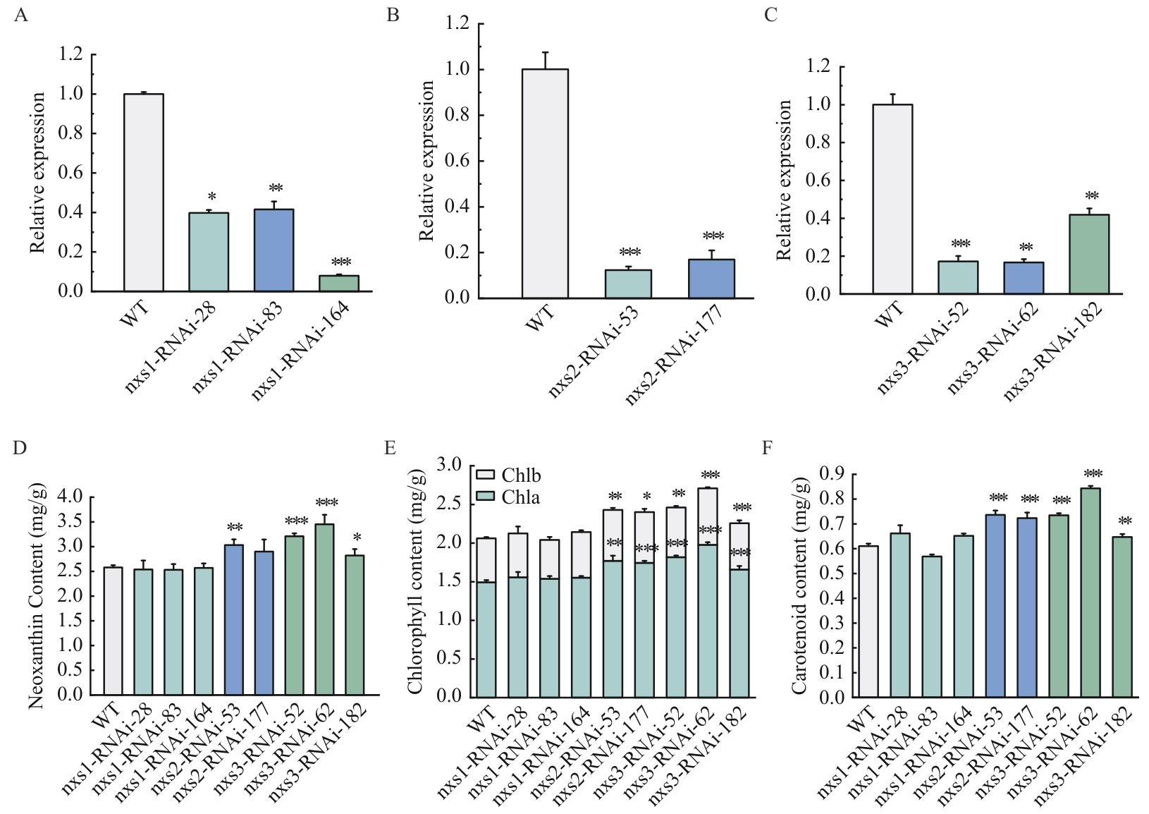 Fig. 3 Transcriptional level and pigment content of the RNAi strainsA: nxs1. B: nxs2. C: nxs3. D: neoxanthin content. E: Chlorophyll content. F: Carotenoid content