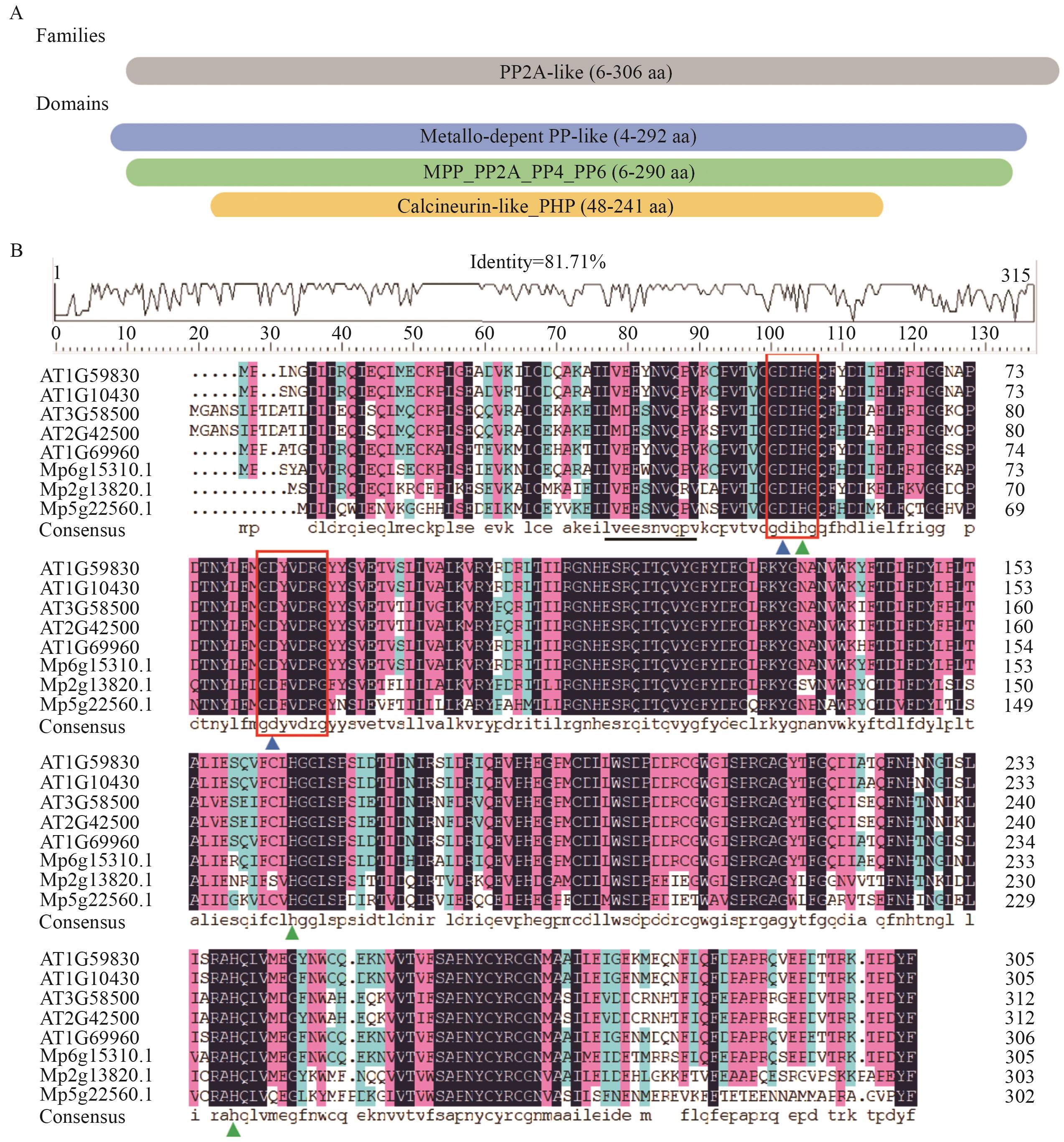 Fig. 2 Conserved domain and sequence alignment of PP2A-C proteins between A. thaliana and M. polymorphaA: Schematic diagram of structural domains in proteins. PP2A-like: Serine/Threonine protein phosphatase PP2A-like. Metallo-depent PP-like: Metallo-dependent phosphatase-like. MPP_PP2A_PP4_PP6: PP2A, PP4, and PP6 phosphoprotein phosphatases, metallophosphatase domain; Calcineurin-like_PHP: Calcineurin-like, phosphoesterase domain. B: Multiple sequence alignment of proteins. The conserved motifs of the catalytic core domain (GDXHG and GDXDRG) are indicated by red boxes; the conserved motif of the A-subunit binding domain (LVEEYNVQEV) is underlined in blue. The blue triangles indicate the metal ion binding site Asp, while the green triangles denote the metal ion binding site Glu