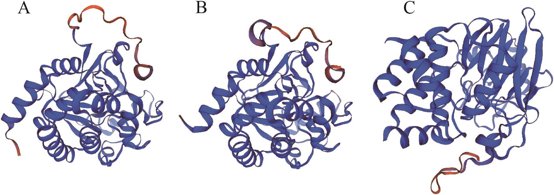 Fig. 3 Tertiary structure of MpPP2A-C proteinA: MpPP2A-C1. B: MpPP2A-C2. C: MpPP2A-C3. All structures are colored by the confidence gradient, with blue indicating high confidence (trustworthy) and red indicating low confidence (unreliable)