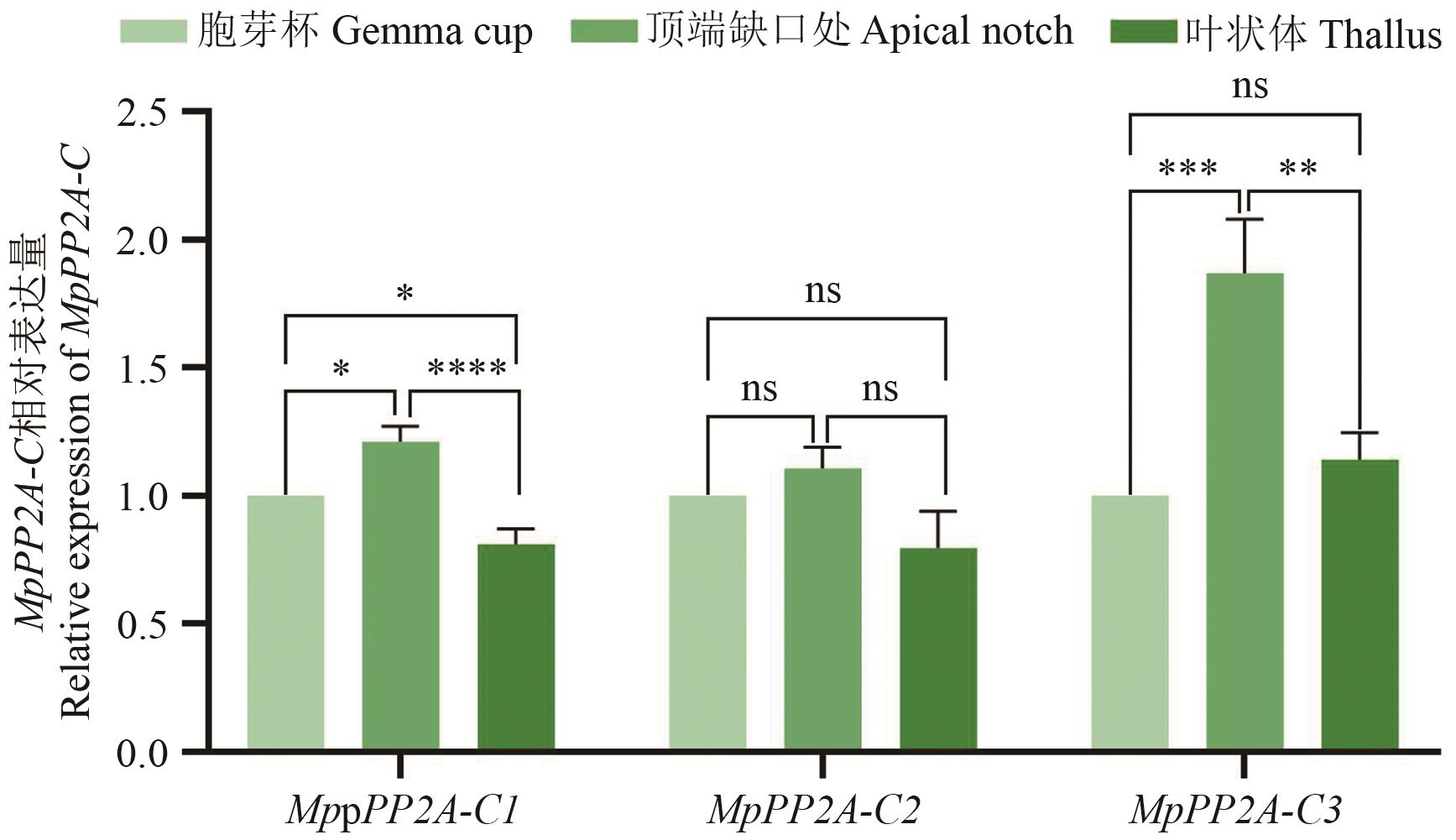 图4 MpPP2A-C基因在地钱不同组织部位中表达量的差异数值指平均值±标准误,****P<0.000 1 (Student’s t-test)