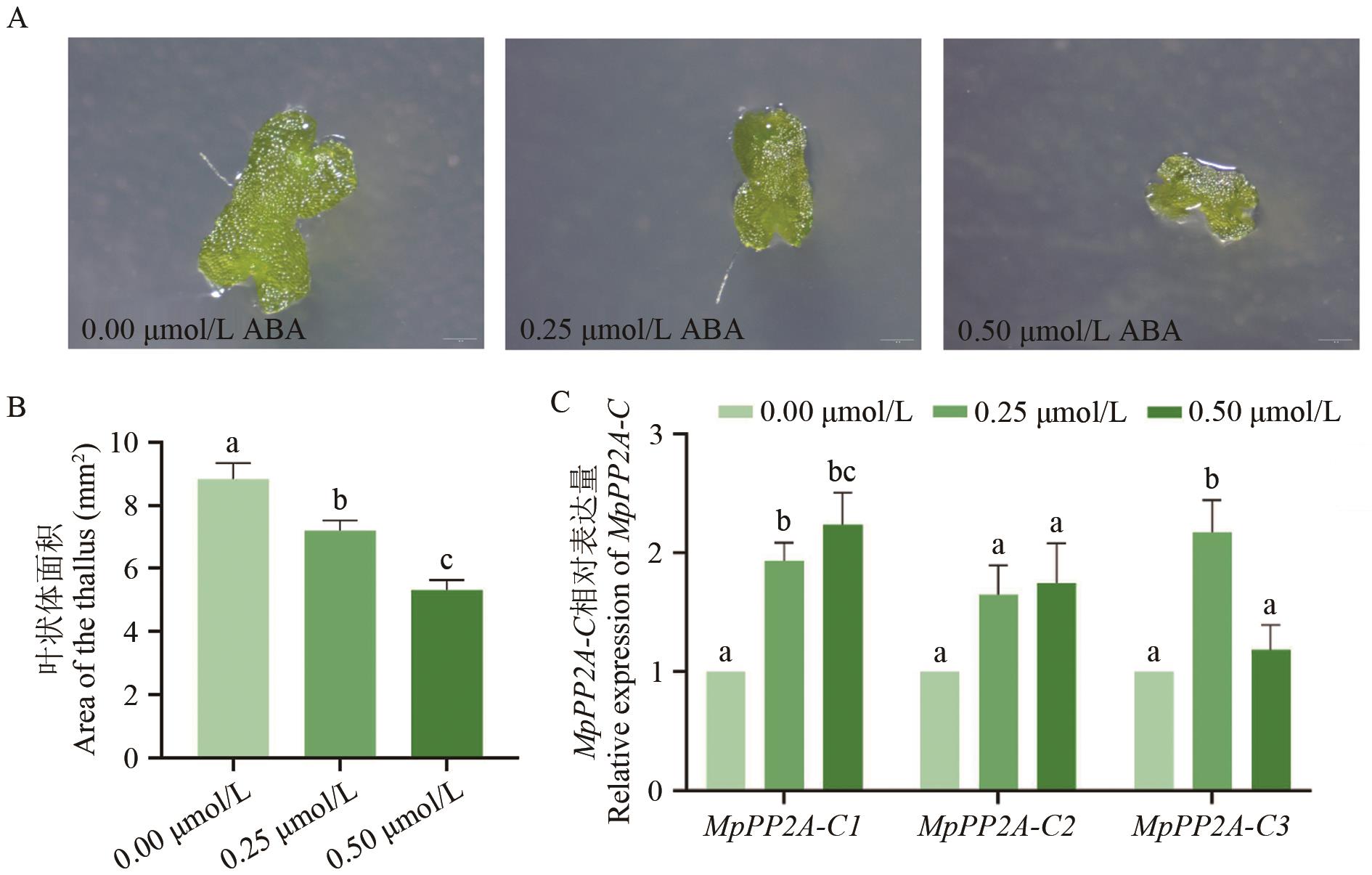 图5 MpPP2A-C基因在不同浓度脱落酸处理下的表型及表达量分析A:不同浓度ABA处理下的地钱叶状体表型对比,标尺长度为1 mm;B:不同浓度ABA处理下的地钱叶状体面积统计;C:MpPP2A-C基因在不同浓度ABA处理下的表达水平。数值指平均值±标准误,小写字母表示组间显著性差异(P<0.05);统计分析采用单因素方差分析结合Duncan多重比较法