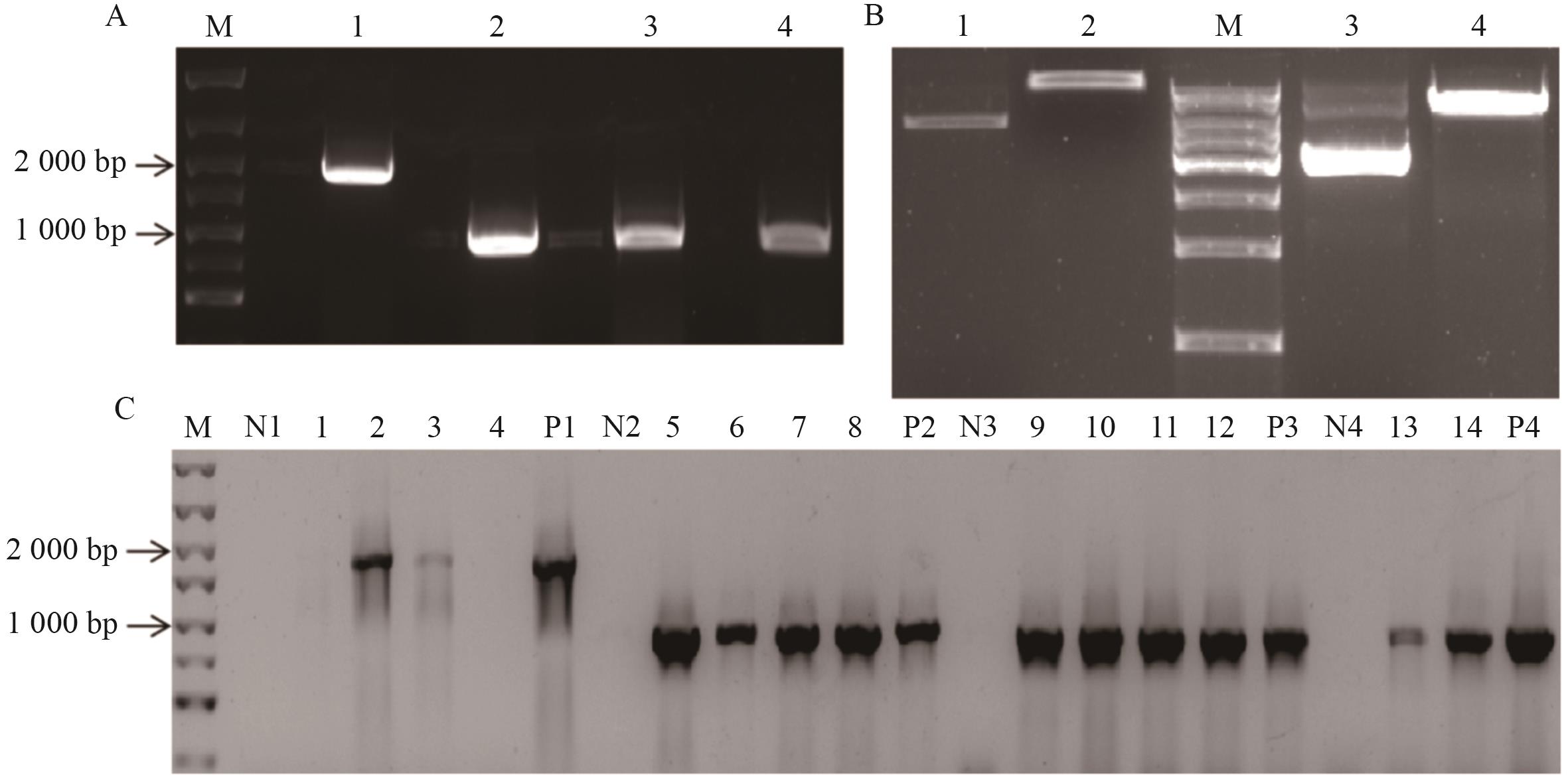 图6 酵母双杂交载体的构建A:MpPP2A-A/C1/C2/C3基因目的片段的扩增(M. DNA Marker;1-4. MpPP2A-A/C1/C2/C3基因的PCR扩增产物);B:pGADT7和pGBKT7质粒的酶切(M. DNA Marker;1. 未酶切pGADT7质粒;2. 酶切后pGADT7质粒;3. 未酶切pGBKT7质粒;4. 酶切后pGBKT7质粒);C:pGADT7-MpPP2A-A/C1载体和pGBKT7-MpPP2A-C2/C3载体的构建(M. DNA Marker;1-4. DH5α-pGADT7-MpPP2A-A菌液,N1. 阴性对照,P1. 阳性对照(MpPP2A-A基因目的片段);5-8. DH5α-pGADT7-MpPP2A-C1菌液,N2. 阴性对照,P2. 阳性对照(MpPP2A-C1基因目的片段);9-12. DH5α-pGBKT7-MpPP2A-C2菌液,N3. 阴性对照,P3. 阳性对照(MpPP2A-C2基因目的片段);13-14. DH5α-pGBKT7-MpPP2A-C3菌液,N4. 阴性对照,P4. 阳性对照(MpPP2A-C2基因目的片段)