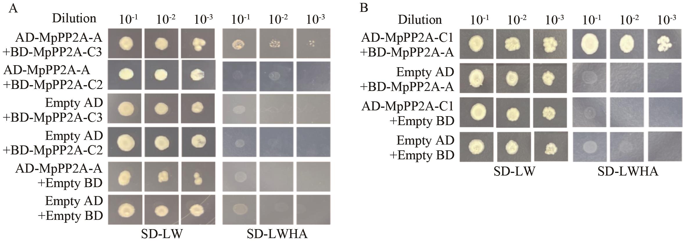 Fig. 7 Results of colonies in the defective mediumA: Verification of the interaction between AD-MpPP2A-A and BD-MpPP2A-C2/C3. B: Verification of the interaction between AD-MpPP2A-C1 and BD-A. SD-LW: Dideficiency medium (lacking leucine and tryptophan). SD-LWHA: Four-Deficiency medium (lacking leucine, tryptophan, histidine and adenine)