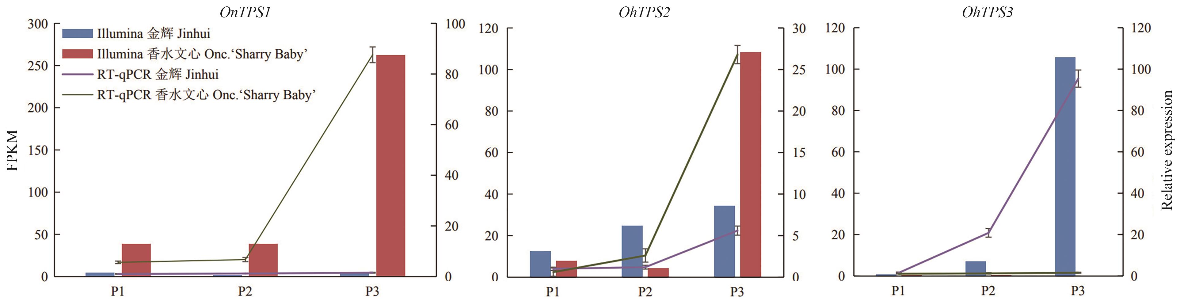 目的 从南茜组培苗中选育出新株系‘金辉’,株型高大,花枝挺立,但无香气。通过解析无香‘金辉’和浓香‘香水文心’花香形成的分子机制,探索‘金辉’无香气制约因素,以期通过分子技术使‘金辉’释放香气。 方法 通过顶空-固相微萃取气相色谱法(HS-SPME)/GC-MS测定文心兰2个品种香气成分及含量。以‘金辉’和‘香水文心’不同发育时期花为材料,通过转录组测序和荧光定量PCR验证,筛选花香形成关键基因。 结果 气相色谱-质谱分析表明,‘香水文心’盛花期花香挥发物总含量显著高于‘金辉’,是‘金辉’的6.1倍,‘香水文心’花香挥发物以单萜为主,‘金辉’花香挥发物以倍半萜为主。转录组测序结果表明,共获得55 277个unigenes,大约81.64%的unigenes被公共数据库注释。单萜形成的上游途径,MEP途径中,多数基因,如CMKHDRHDSGPPS等在‘香水文心’中表达高于‘金辉’,使生成单萜的前体物质GPP在‘香水文心’中积累。倍半萜形成的上游途径,MVA途径中,约一半基因在‘香水文心’中略高表达,一半基因在‘金辉’中略高表达。转录组数据中共筛选出3个显著差异表达的萜类合成酶基因(TPS)。其中,OhTPS1OhTPS2属于TPS-b家族,主要由单萜合成酶(mono-TPSs)基因组成。OhTPS1OhTPS2在‘香水文兰’中表达显著高于‘金辉’中,且在‘香水文心’中随着花的发育逐渐升高,表明这2个基因在‘香水文心’单萜生物合成中起关键作用。OhTPS3属于TPS-a家族,主要由倍半萜合成酶(sesqui-TPSs)基因组成。OhTPS3 在‘金辉’中表达显著高于‘香水文心’中,且在‘金辉’中随着花的发育逐渐升高,表明这个基因在‘金辉’倍半萜生物合成中起关键作用。 结论 ‘金辉’花香挥发物总量低的主要原因是MEP途径多数关键基因低表达,一定程度限制代谢流向单萜前体物质GPP积累,同时单萜合成酶基因的低表达,也一定程度阻碍单帖挥发物的生成。