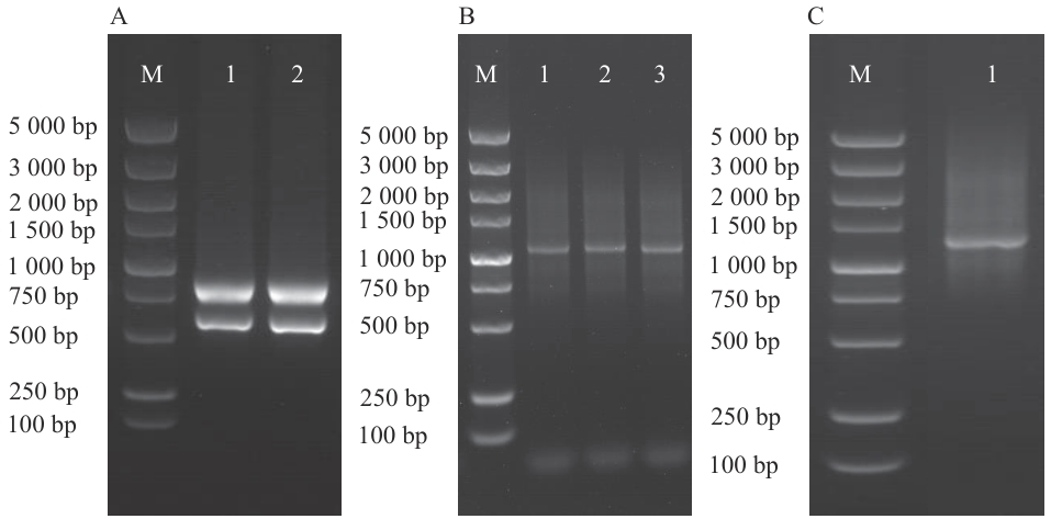 Fig. 1 RNA extraction and identification of synthesized ds cDNAA: Sample RNA extraction (M: Marker, 1‒2: alfalfa (Medicago sativa) samples). B: Amplified results of synthesized ds cDNA (M: Marker; 1: P1-F/P4-R amplified ds cDNA; 2: P2-F/P4-R amplified ds cDNA; 3: P3-F/P4-R amplified ds cDNA). C: Purified and removed small fragments (M: Marker; 1: results after the three ds cDNAs were mixed and purified)