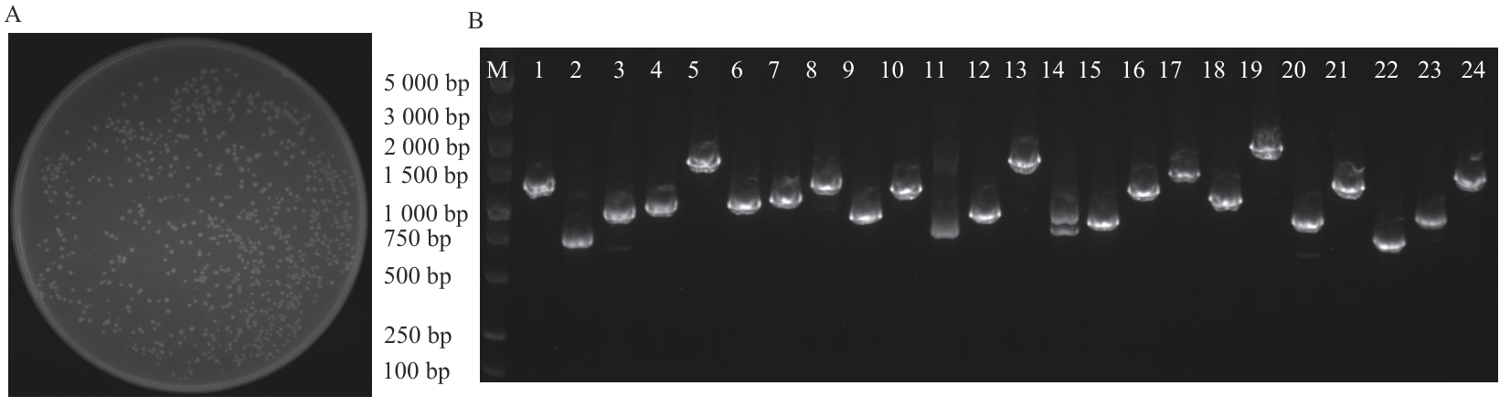 Fig. 2 Count and library identification of Escherichia coli colonyA: Library capacity and clone count. B: PCR identification of library quality (M: DNA marker; 1‒24: 24 different cloned colonies)