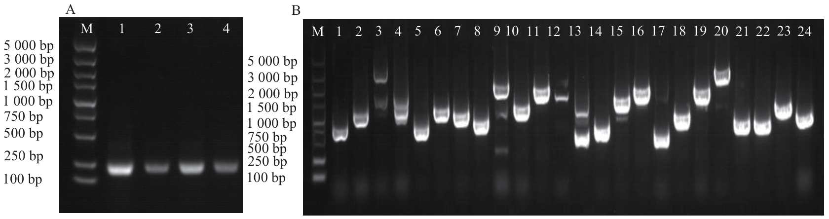 Fig. 3 PCR identification of yeast transformed with empty vector (A) and library cultures (B)In Fig. A, M: marker, 1-4: yeast transformation empty vector. In Fig. B, M: DNA marker, 1-24: yeast library colonies