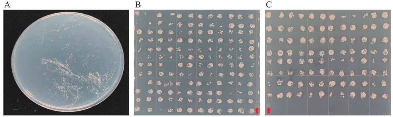 Fig. 5 Positive clone plate and results of rotation verificationA: The result of applying the library bacterial solution on 1.5 mol/L NaCl solid culture medium. B: Verification results of monoclonal colony rotation (144). C: Verification results of monoclonal colony rotation (96). : Control group