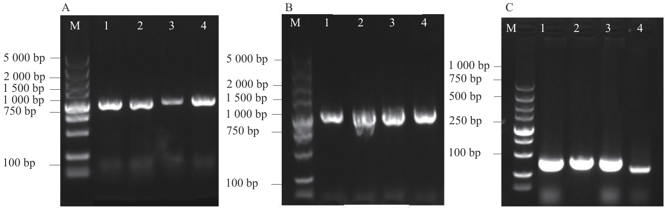 Fig. 8 Detection vector colony PCRA: Vector construction colony PCR (1: pBⅠ-MsG5270; 2: pBⅠ-MsG0180; 3: pBⅠ-MsG9320; 4: pBⅠ-MsG9120). B: Agrobacterium transformed colony PCR (1: pBⅠ-MsG5270; 2: pBⅠ- MsG0180; 3: pBⅠ-MsG9320; 4: pBⅠ-MsG9120). C: cDNA PCR identification (1: pBⅠ-MsG5270; 2: pBⅠ-MsG0180; 3: pBⅠ-MsG9320; 4: pBⅠ-MsG9120)