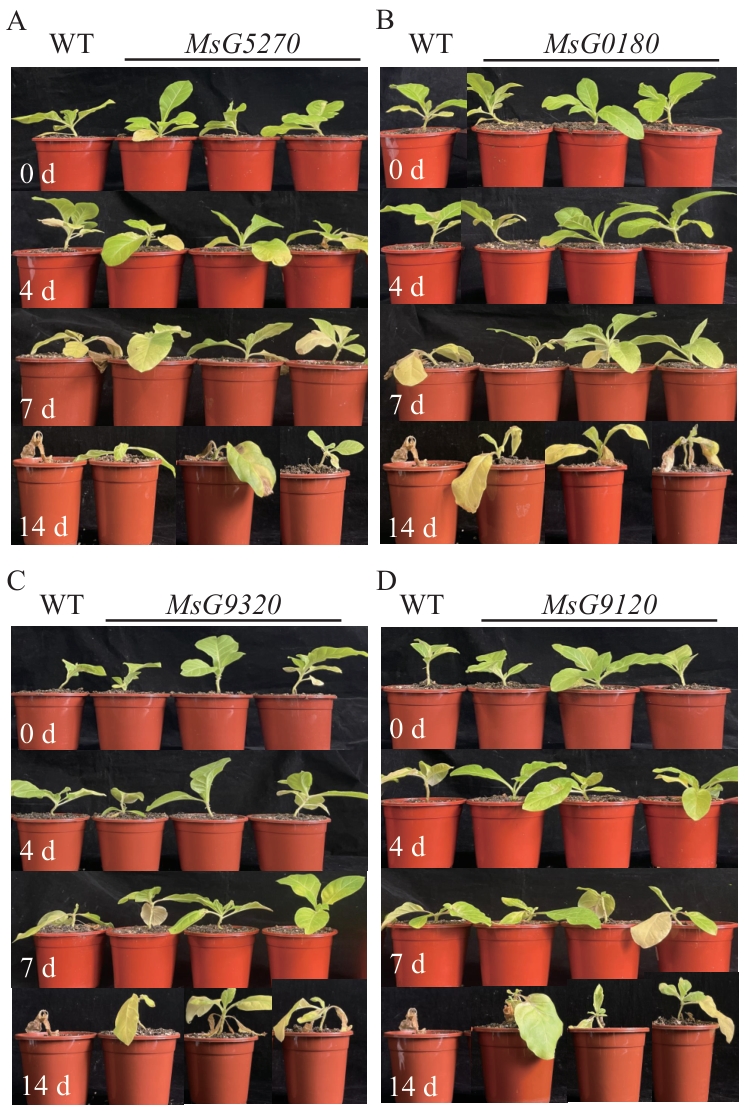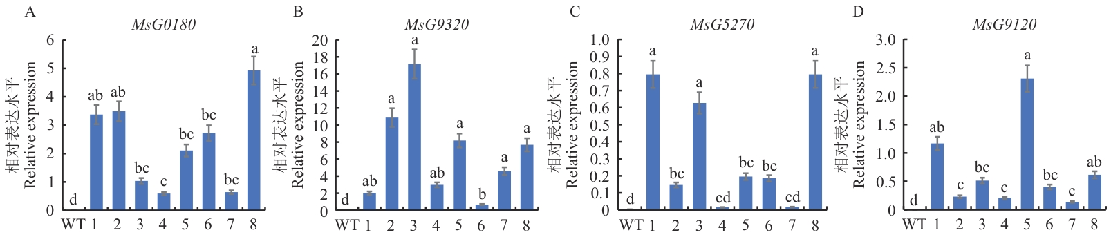 Fig. 9 Expression analysis of MsG0180, MsG9320, MsG5270, and MsG9120Different letters indicate significant differences at P<0.05 level. The data are in means ±SE (n=3), WT: Wild type; 1‒8: transgenic plants
