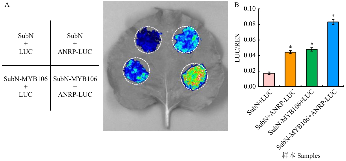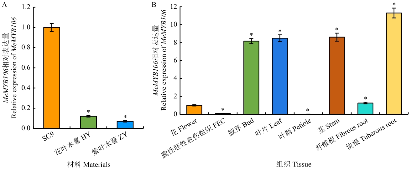 图3 MeMYB106基因的表达模式分析A:MeMYB106在不同颜色木薯叶片中的相对表达量;B:MeMYB106在SC9不同组织中的相对表达量。*P<0.05,下同