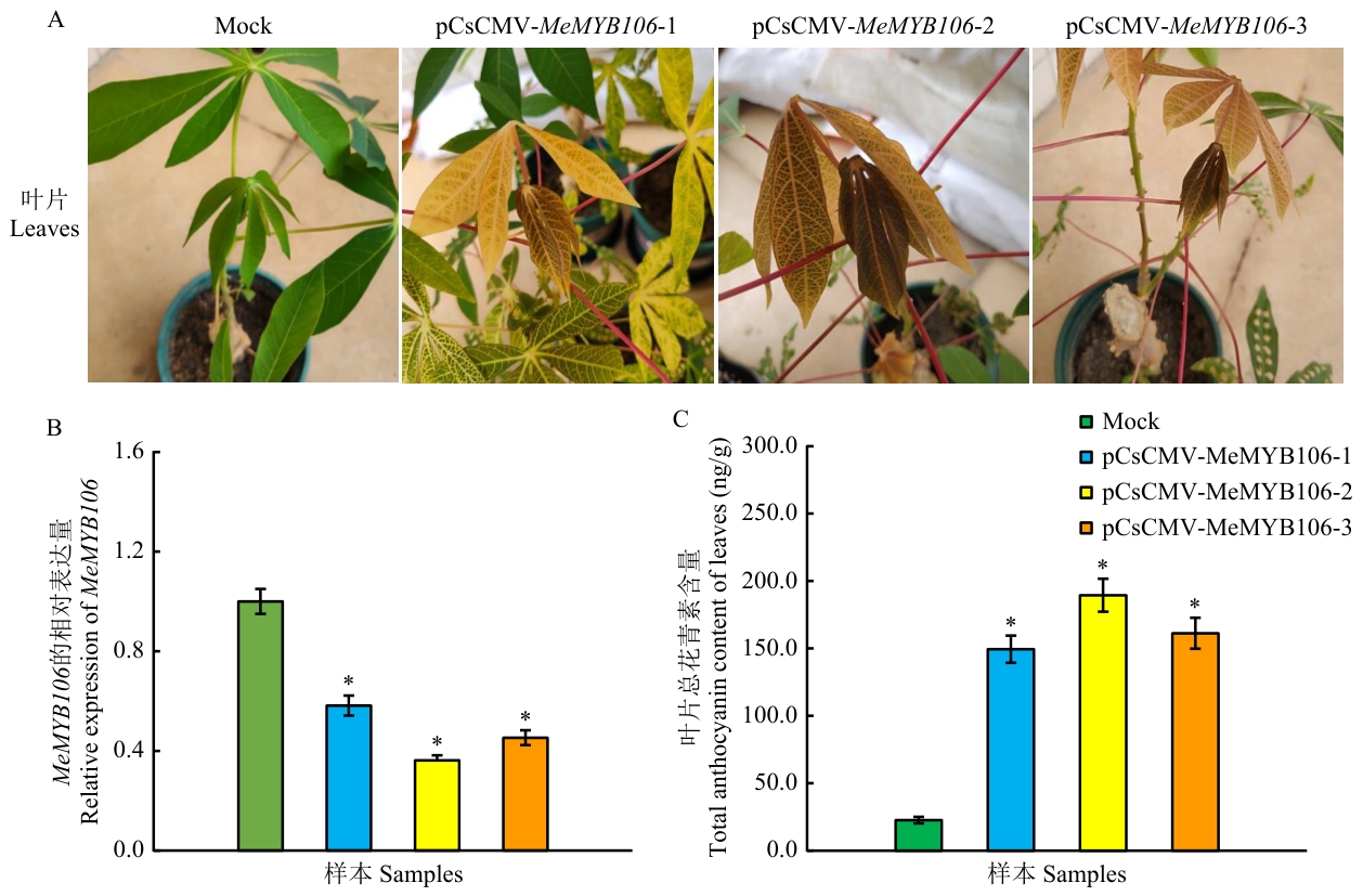 图4 MeMYB106沉默植株表型及花青素含量鉴定A:MeMYB106沉默植株表型;B:对照植株和沉默植株中MeMYB106的表达水平;C:对照植株和沉默植株叶片总花青素含量