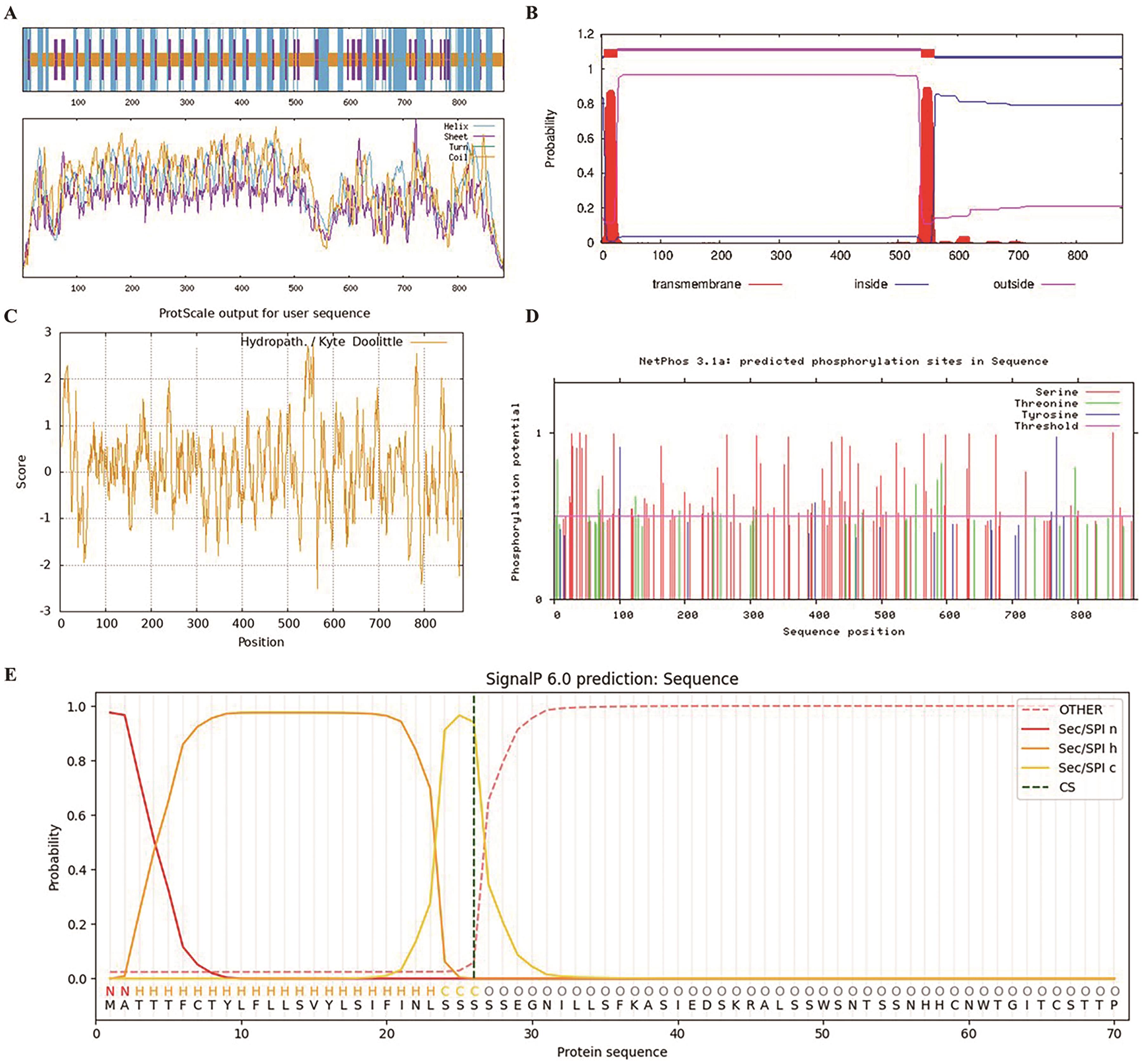 Fig. 1 Bioinformatics analysis of GmRLK19A: Secondary structure prediction; B: transmembrane structure prediction; C: hydrophilic/hydrophobic prediction; D: phosphorylation site prediction; E: signal peptide prediction