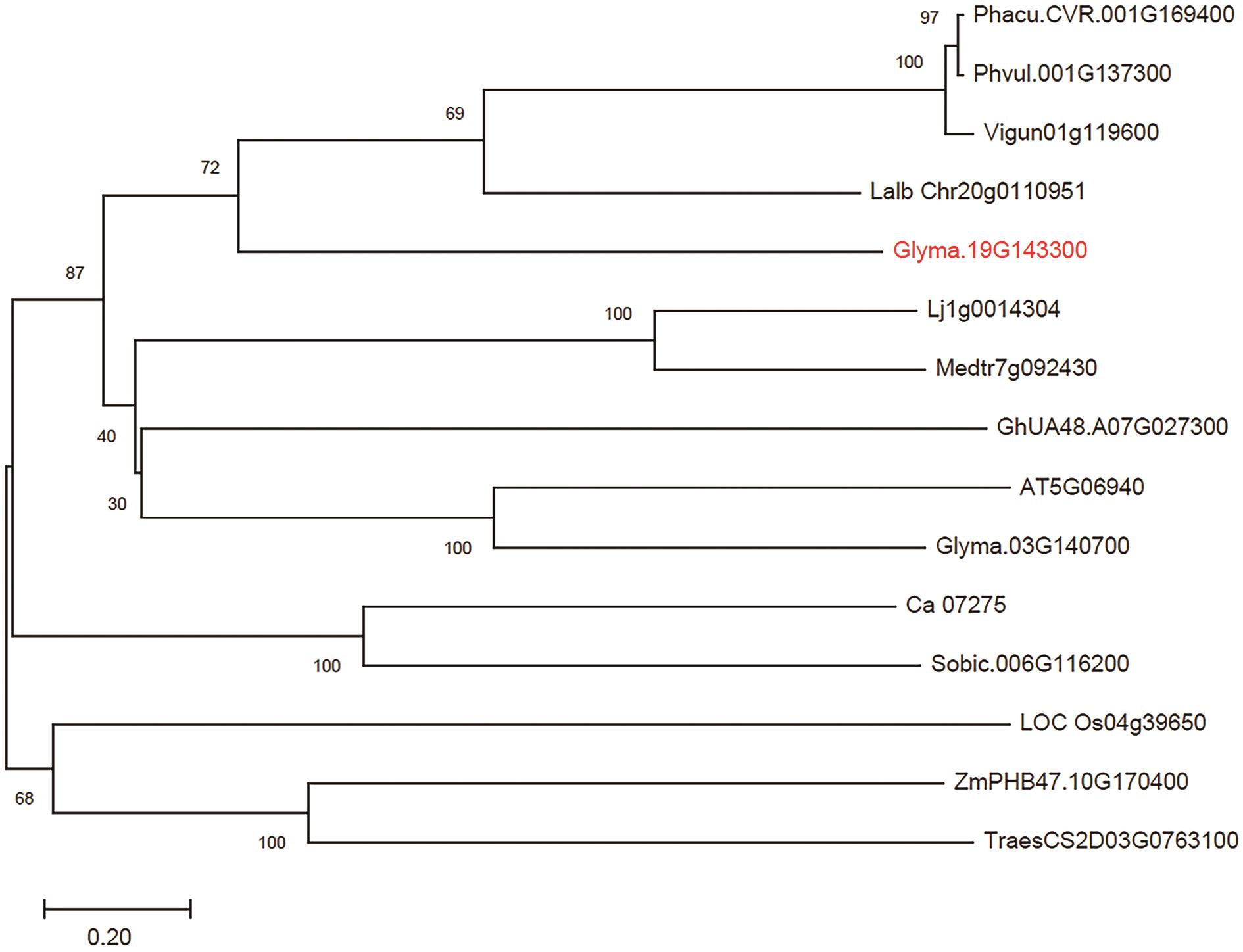 图2 GmRLK19及其同源蛋白的系统进化树分析GmRLK19及其同源蛋白的进化树分析,节点上的数字表示1 000次Bootstrap值。使用与GmRLK19同源的14个蛋白质的氨基酸全长序列绘制,包括,Phacu.CVR.001G169400,尖叶菜豆;Phvul.001G137300,菜豆/四季豆;Vigun01g119600,豇豆;Lalb Chr20g0110951,白羽扇豆;Glyma.19G143300,大豆;Lj1g0014304,百脉根;Medtr7g092430,蒺藜苜蓿;GhUA48.A07G027300,棉花;AT5G06940,拟南芥;Glyma.03G140700,大豆;Ca_07275,鹰嘴豆;Sobic.006G116200,高粱;LOC Os04g39650,水稻;ZmPHB47.10G170400,玉米;TraesCS2D03G0763100,小麦