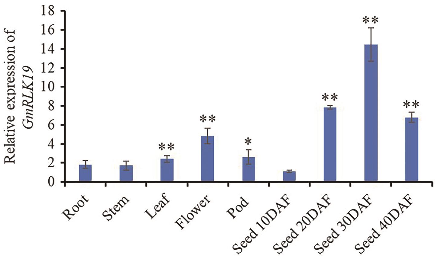 图3 GmRLK19在大豆不同组织中的相对表达量各组织样品分别选自PI595843品种14 d苗龄的根、茎、叶、2 cm的荚以及开花后10-40 d发育的籽粒。不同组织和不同发育时期籽粒的基因相对表达量均分别以开花后10 d的籽粒中的表达量进行标准化,即作为对照(相对表达量 = 1)。误差线代表标准误差(n = 3)。Root:根;Stem:茎;Leaf:叶片;Flower:花;Pod:荚;Seed 10DAF - Seed 40DAF分别表示开花后10、20、30和40 d的籽粒。*和**分别表示各个组织与10 DAF籽粒在0.05和0.01水平上的差异显著性(Student’s t-test, two-tail)