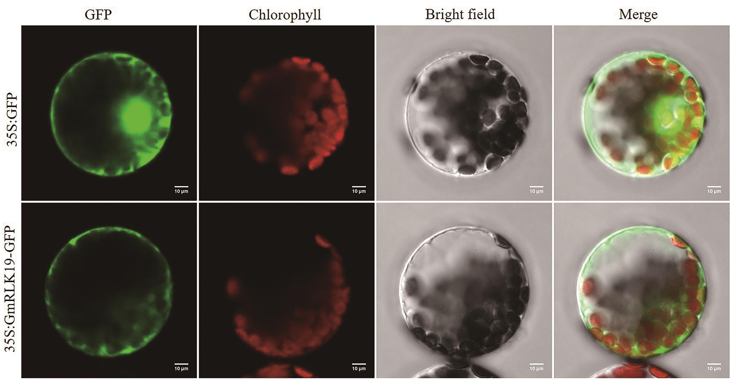 图4 GmRLK19蛋白的亚细胞定位在CaMV 35S启动子控制下,GFP蛋白及GmRLK19-GFP融合蛋白在拟南芥原生质体中的瞬时表达。GFP,绿色荧光蛋白;Chlorophyll,叶绿体自发荧光;Bright field,明场;Merge,叠加。比例尺为10 μm
