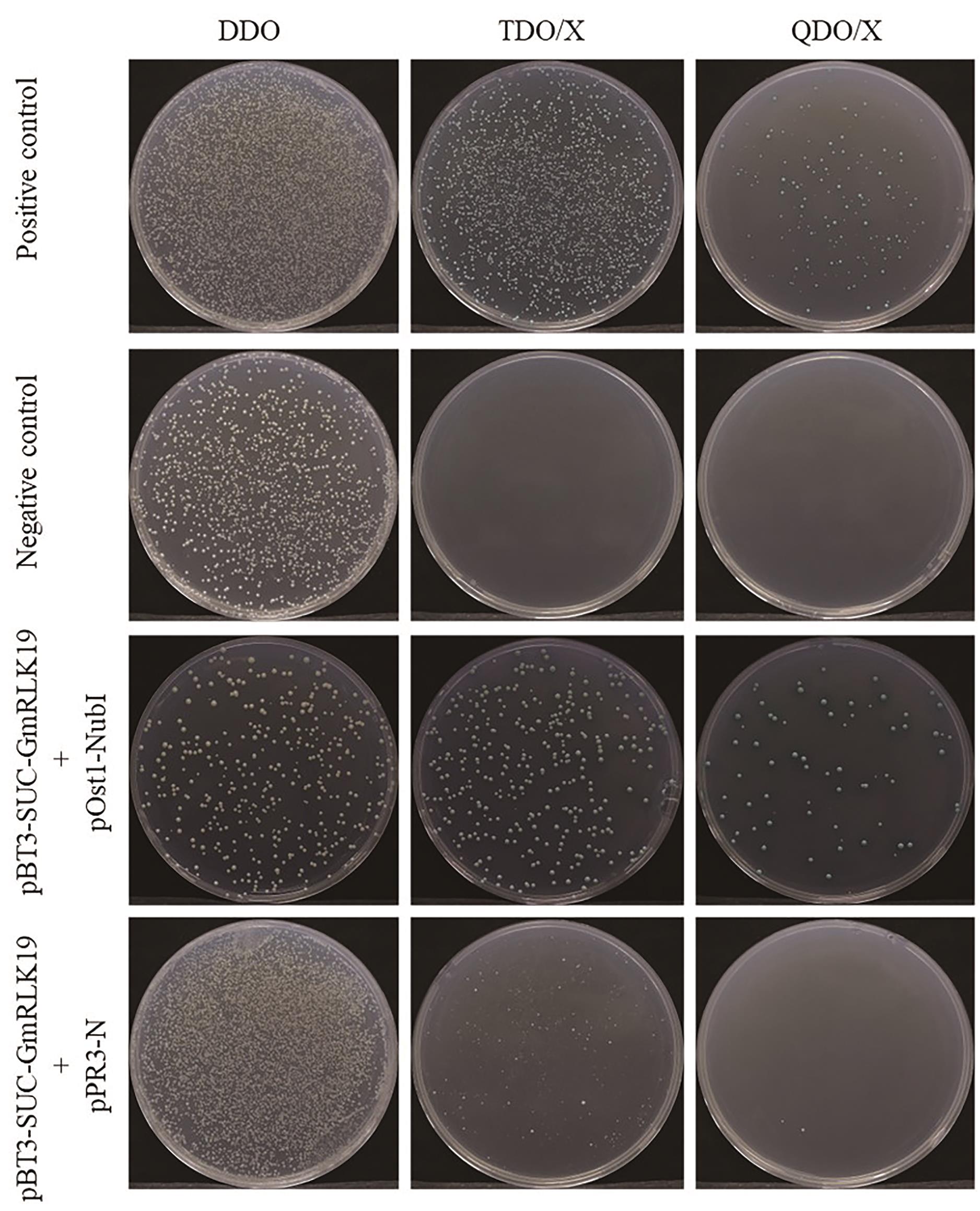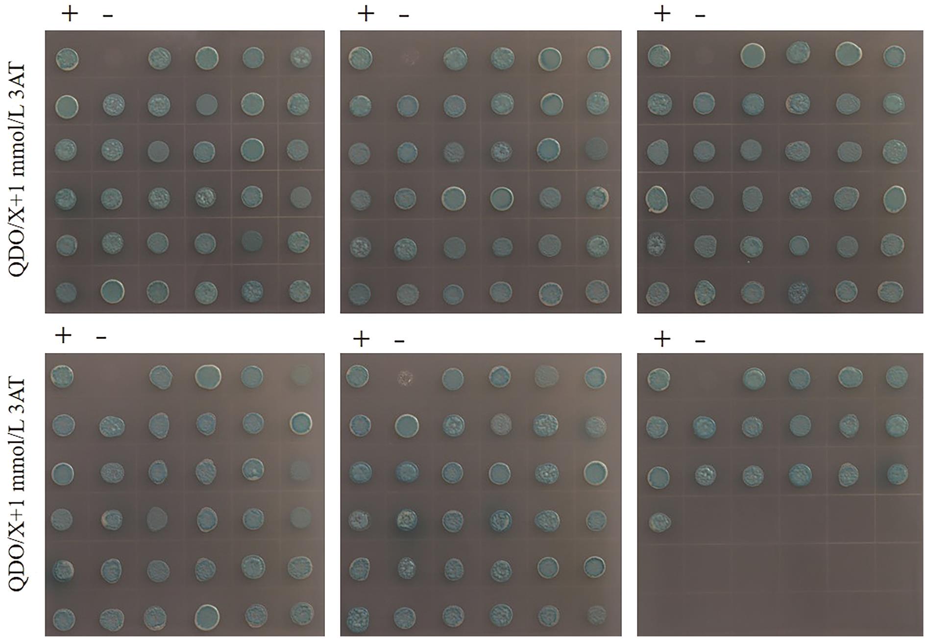 Fig. 5 Results of self-activation detectionFrom top to bottom, the groups are: positive control, negative control, functional validation group, and self-activation group. From left to right, the plates are: DDO, TDO/X, and QDO/X plate