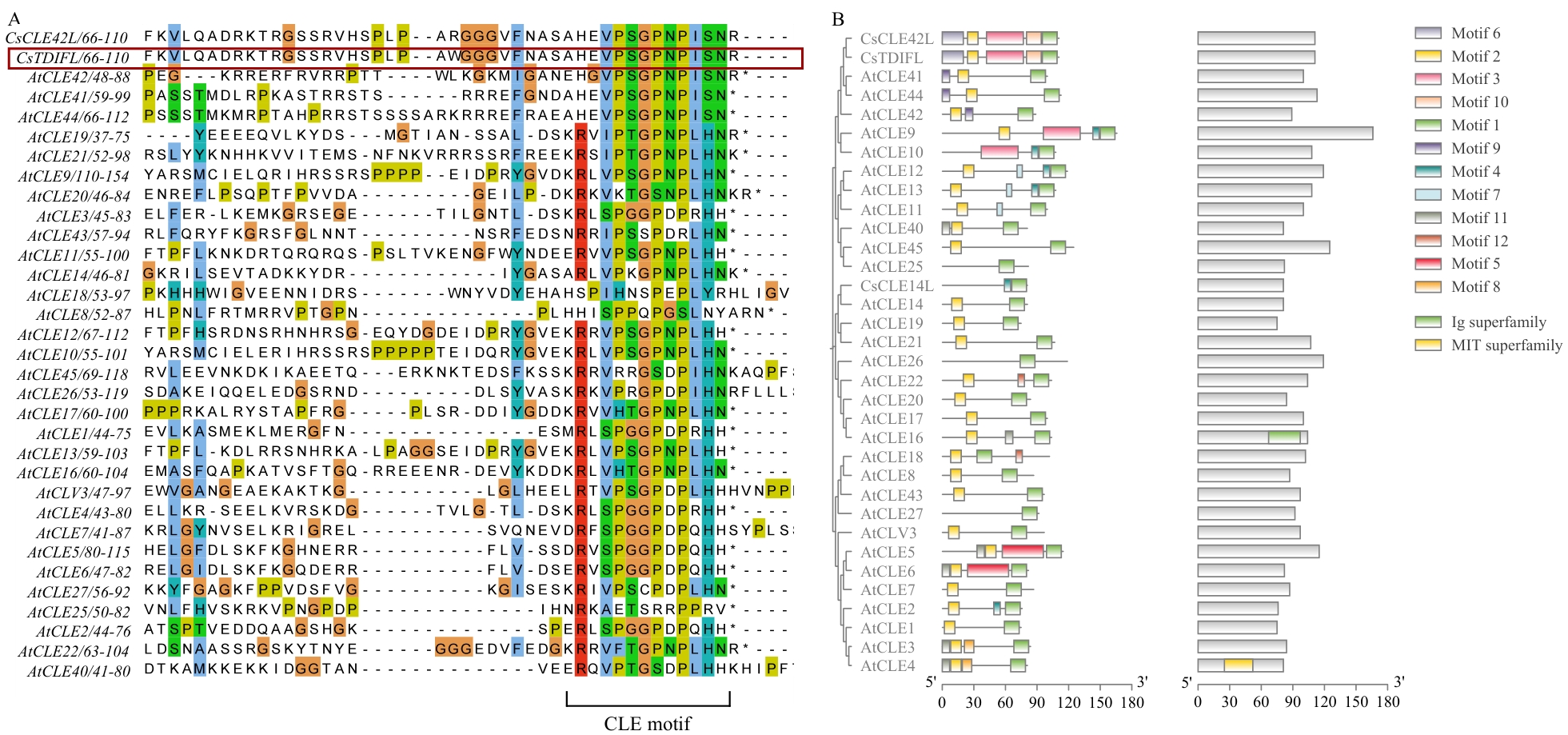 Fig. 2 Cloning, sequence homology and phylogenetic analysis of the CsTDIFL geneA:Amino acid sequence alignment analysis of CsTDIFL protein with the Arabidopsis CLE family. B:Phylogenetic tree and motif analysis of CsTDIFL protein and the Arabidopsis CLE family proteins