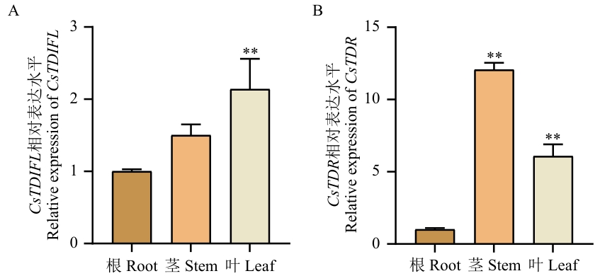 图3 CsTDIFL和CsTDR在茶树不同组织间的表达水平**表示极显著差异(P<0.01)
