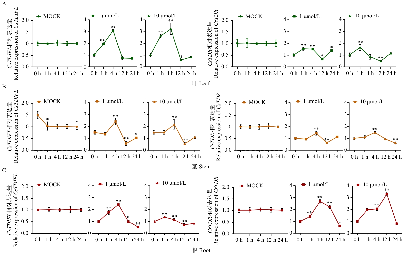 图4 茶树CsTDIFL及CsTDR对外源TDIF多肽激素的响应A‒C分别表示茶树叶、茎、根样品在TDIF多肽激素0 μmol/L(MOCK)、1 μmol/L和10 μmol/L处理下CsTDIFL和CsTDR的相对表达量;横坐标1‒24 h表示取样时间,处理前记为0 h;图中数据(A‒C)表示3个生物重复的平均值±SD。*表示显著性差异(P<0.05),**表示极显著性差异(P<0.01)。下同