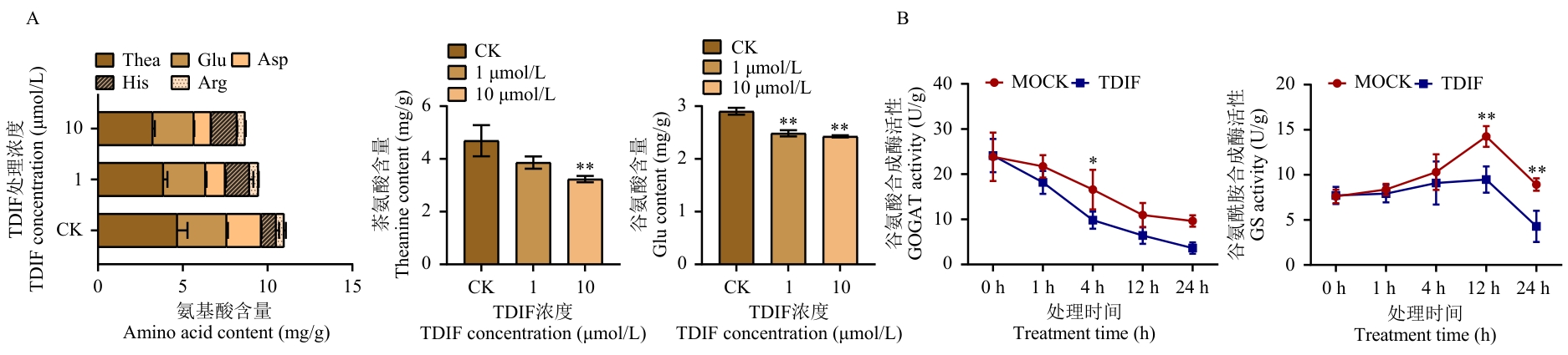 图5 TDIF处理期间氨基酸含量及氮代谢关键酶活的动态变化A:TDIF处理24 h主要游离氨基酸的积累情况;B:TDIF处理0、1、4、12和24 h氮代谢关键酶活的动态变化
