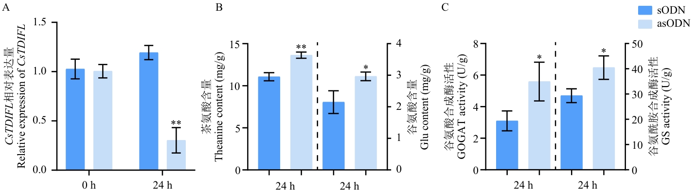 Fig. 6 Effects of antisense oligonucleotide inhibiting CsTDIFL on theanine contentA: CsTDIFL expressions after 24 h asODN treatment. B: Theanine and glutamate contents after 24 h of asODN treatment. C: GOGAT/GS enzyme activity after 24 h of asODN treatment