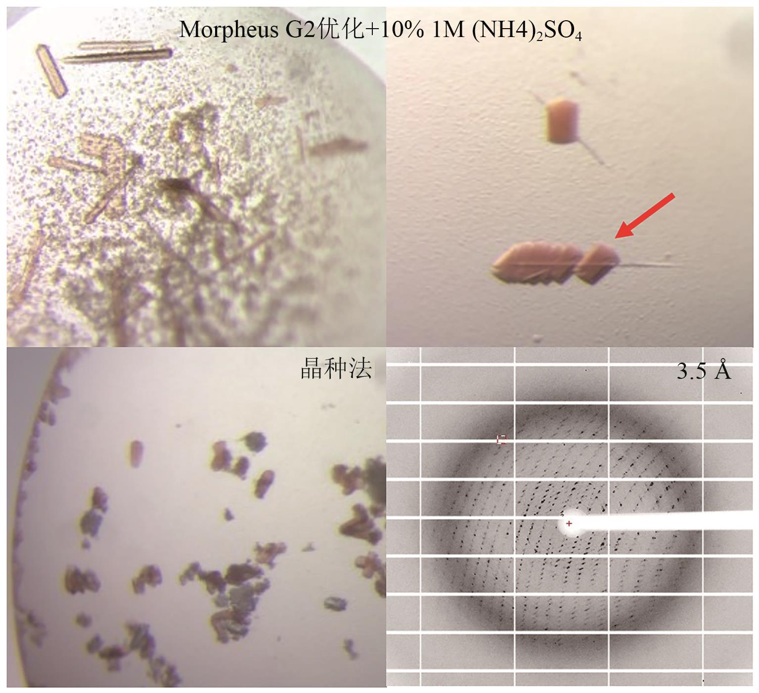 Objective Protein crystallographic diffraction is an essential technique in structural biology research. The diffraction resolution of crystals directly determines the accuracy of atomic models and their practical applicability. Therefore, a combination of multiple strategies is required to optimize protein crystallization quality and enhance diffraction resolution. Method The P450 enzyme, which catalyzes aryl coupling reactions, was chosen as the research focus. A prokaryotic expression system was first constructed via molecular biology techniques. The protein was purified using nickel-affinity chromatography and size-exclusion chromatography. During the crystallization stage, 1,632 initial conditions were systematically screened through the vapor diffusion method. Based on preliminary results, key variables including buffer pH, precipitant type and concentration were finely optimized, and various additives were introduced to improve the crystallization environment. Furthermore, rational truncation of flexible regions was designed according to structural predictions, and SUMO tag fusion was attempted to enhance protein stability. Result The P450 protein was successfully expressed solubly at high levels in E. coli and purified to high purity via a two-step purification process, making it suitable for crystallization screening. Through large-scale crystallization condition screening and multiple rounds of optimization, combined with synergistic strategies including sequence truncation and SUMO fusion, crystal morphology was significantly improved—transitioning from initial microcrystals or amorphous precipitates to well-defined single crystals with regular shapes and sharp edges. The diffraction resolution of the crystals was markedly enhanced from an initial 10 Å to 2.86 Å, yielding high-quality crystals suitable for high-resolution structural analysis. Conclusion By employing a multi-strategy synergy, the protein crystal morphology and diffraction resolution of protein crystals is significantly enhanced.