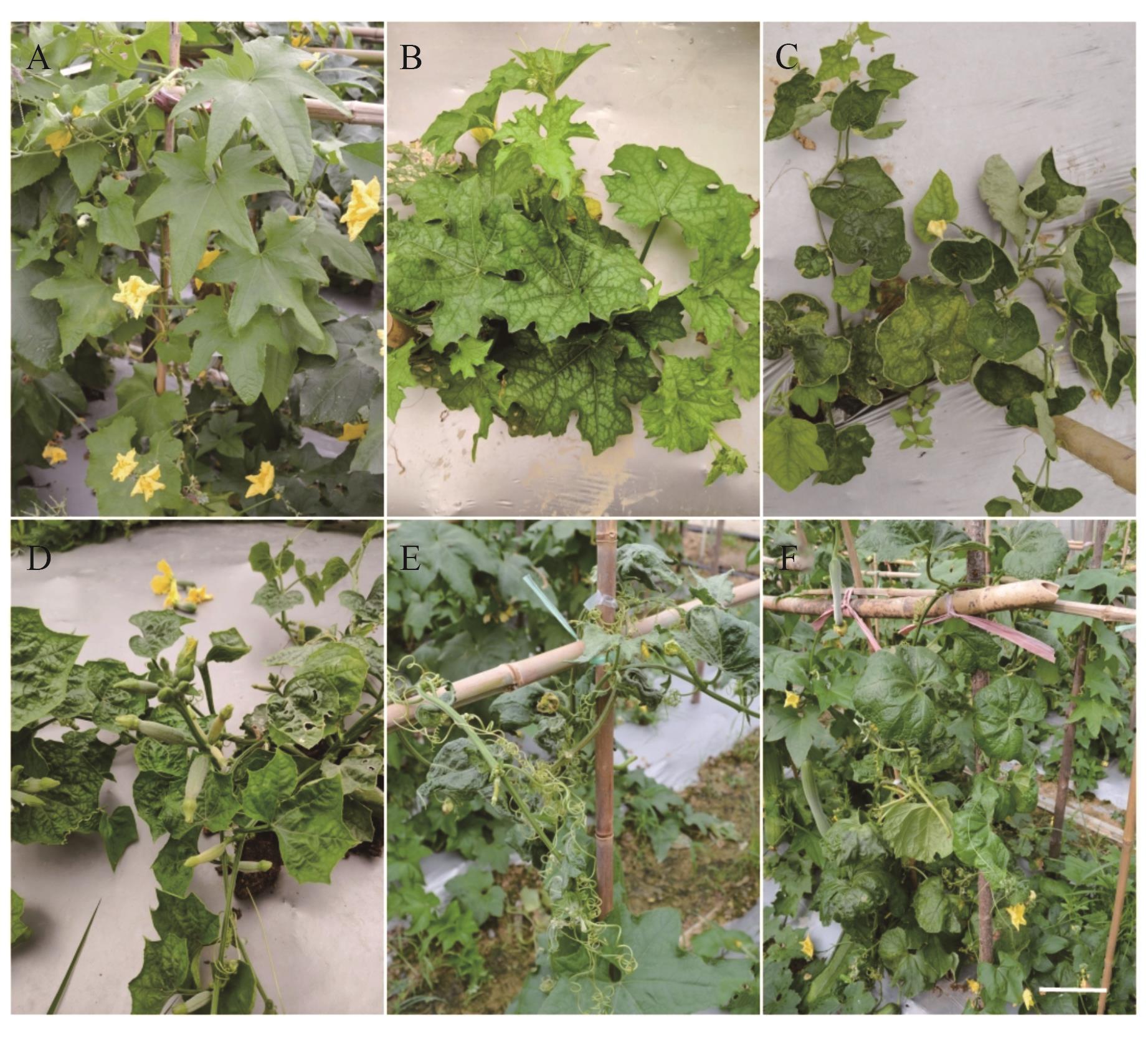 图4 M2群体果型变异情况A:野生型;B:瓜长变短;C:瓜色变亮;D:瓜粉增多;E:瓜色嵌合;F:瓜长变长;标尺=10 cm