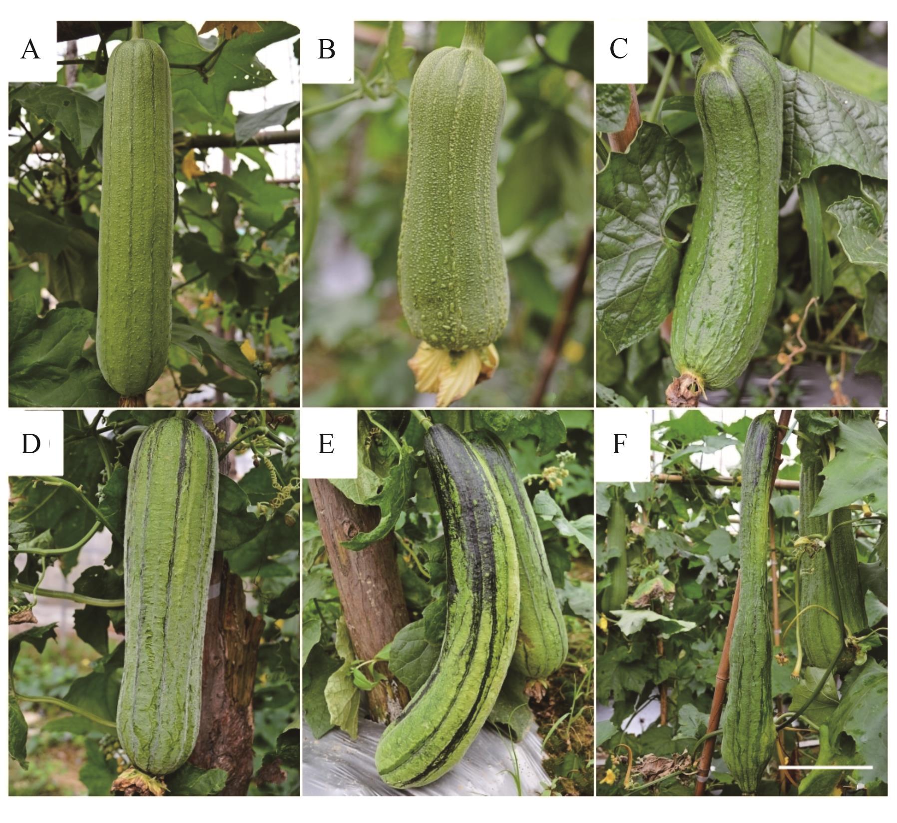Fig. 4 Mutant phenotypes of fruit shape in M2 populationA: Wild type. B: Length shorter. C: Color brighter. D: Powder increase. E: Color mosaic. F: Length longer. Bar =10 cm