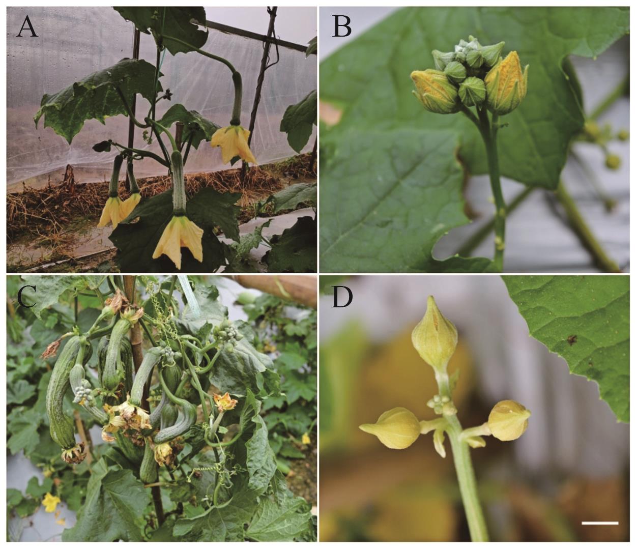 Fig. 5 Mutant phenotypes of reproductive organs in M2 populationA: Wild type female flowers. B: Wild type male flowers. C: Clustered female flowers. D: Yellowing male flowers. Bar =1 cm