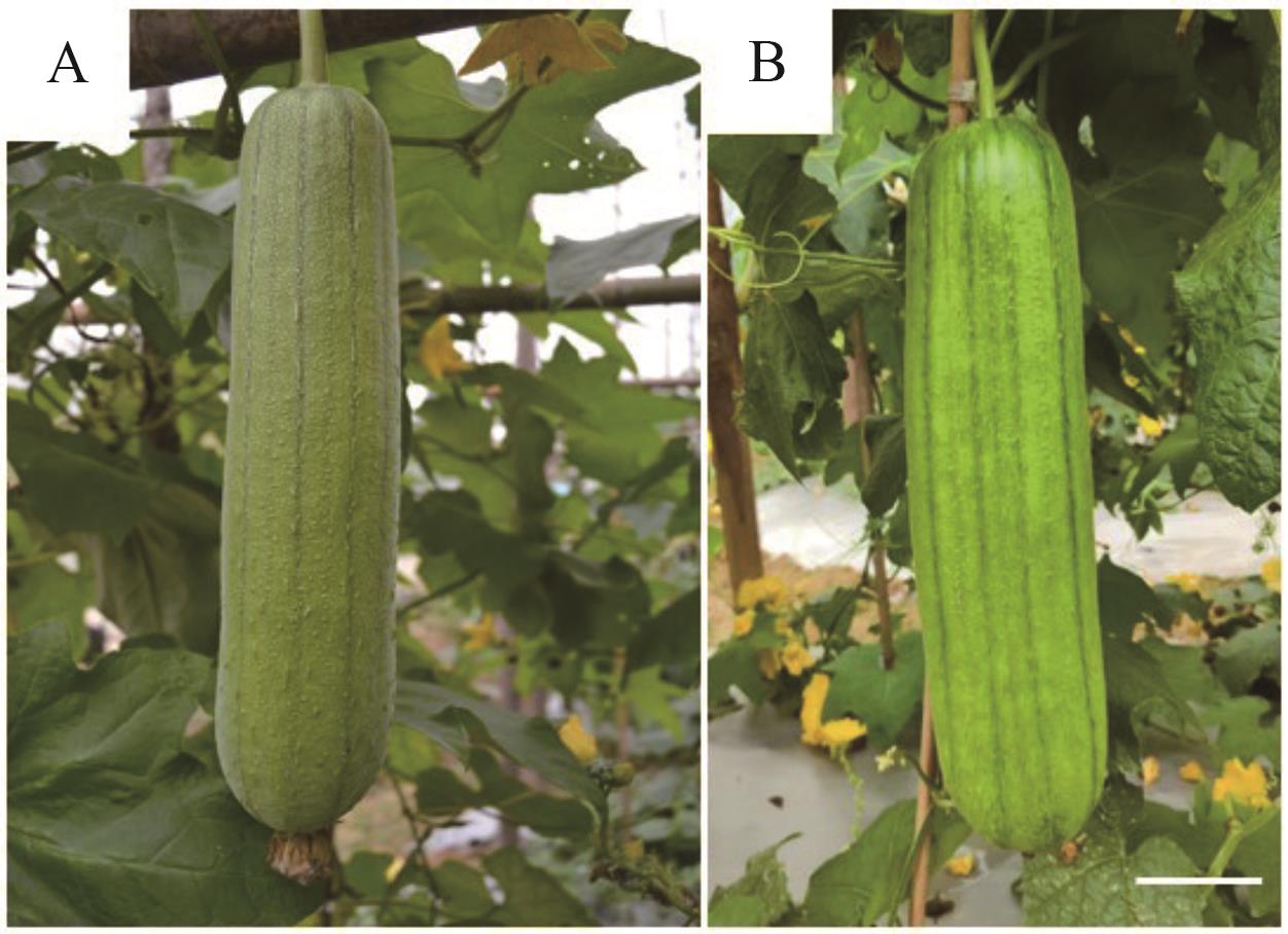 图6 油亮瓜皮突变体A:野生型果实;B:油亮瓜皮果实;标尺=5 cm glossy fruit peel