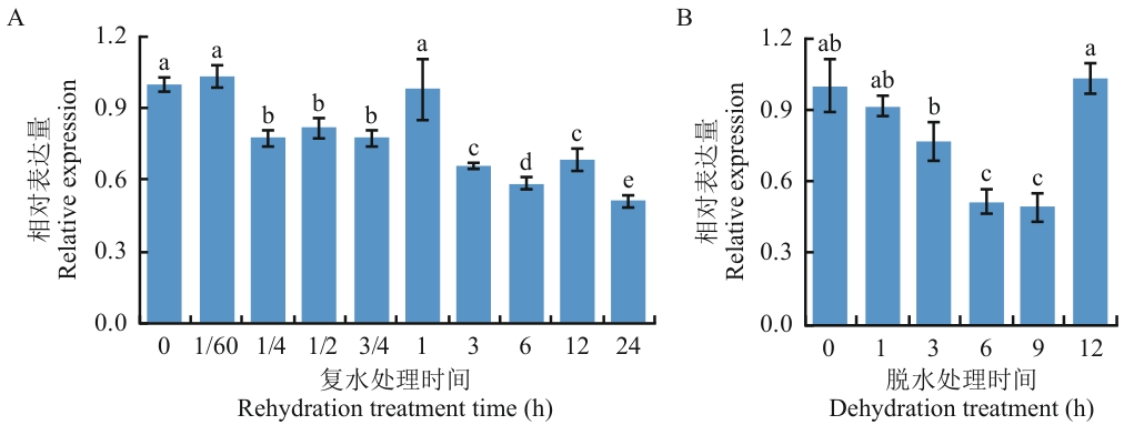 Fig. 1 Expression analysis of RcOLEO1 during rehydration and dehydration treatments of Racomitrium canescensThe error bars indicates the standard deviation, and the letters on the error bars indicate different significance (P<0.05), the same below
