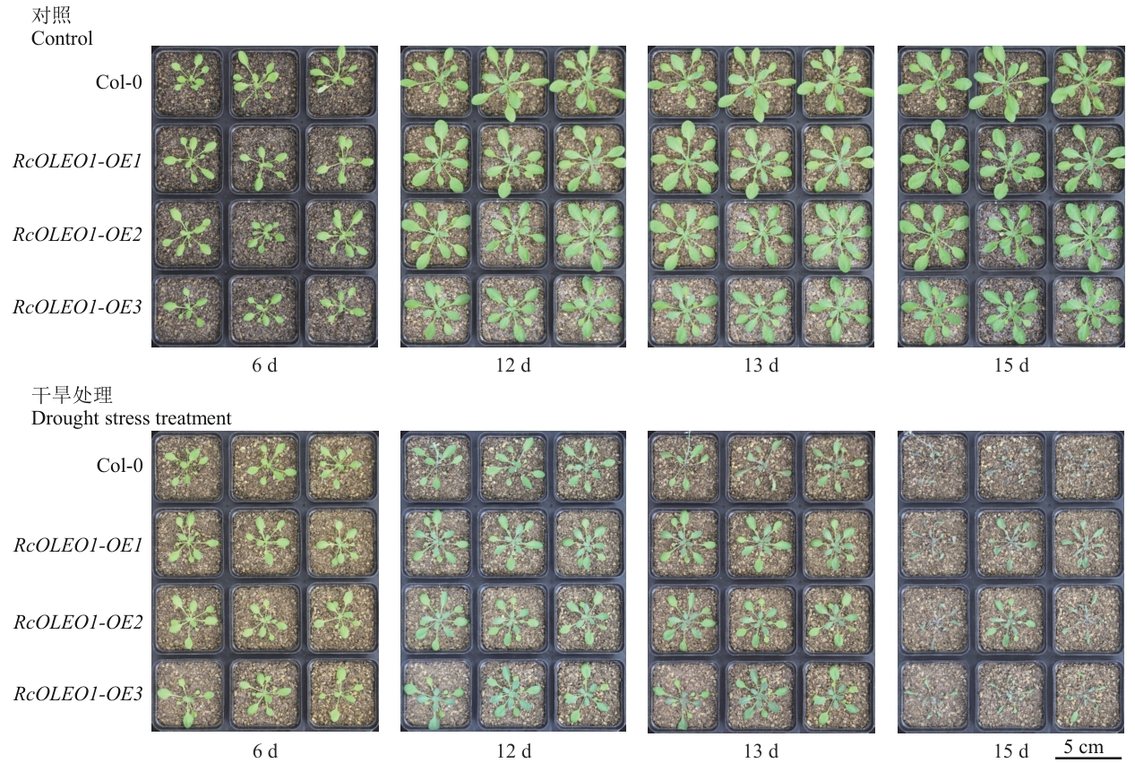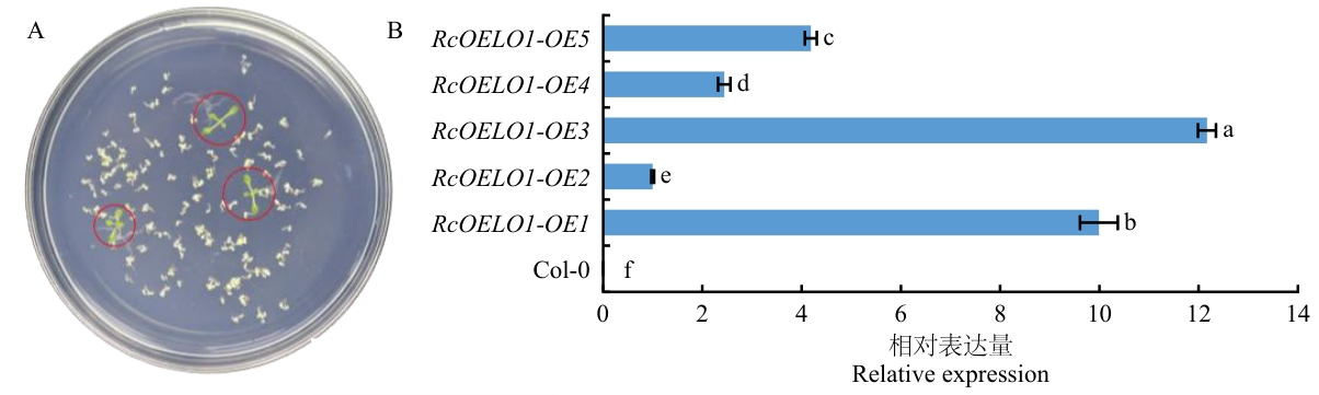 图3 RcOLEO1过表达转基因拟南芥的筛选及鉴定A:RcOLEO1过表达转基因拟南芥T1代植株的筛选;B:RcOLEO1过表达转基因拟南芥T2代植株的鉴定