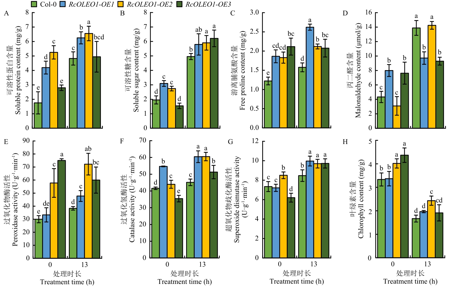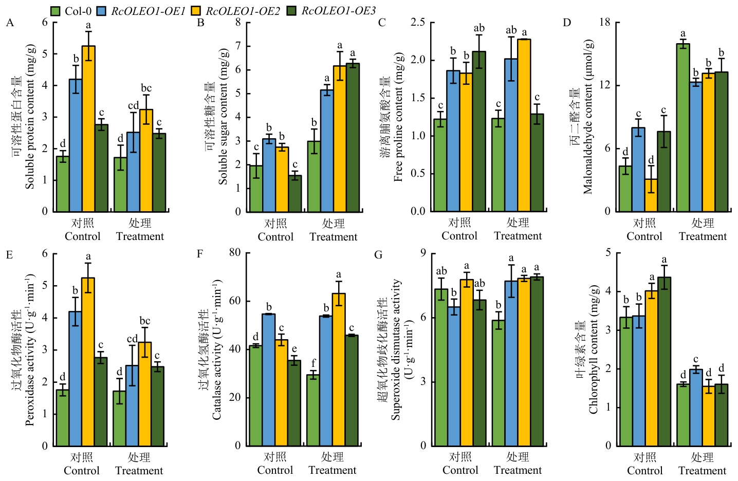Fig. 5 Changes in physiological and biochemical indexes of wild-type and RcOLEO1 overexpression transgenic A. thaliana under drought treatment