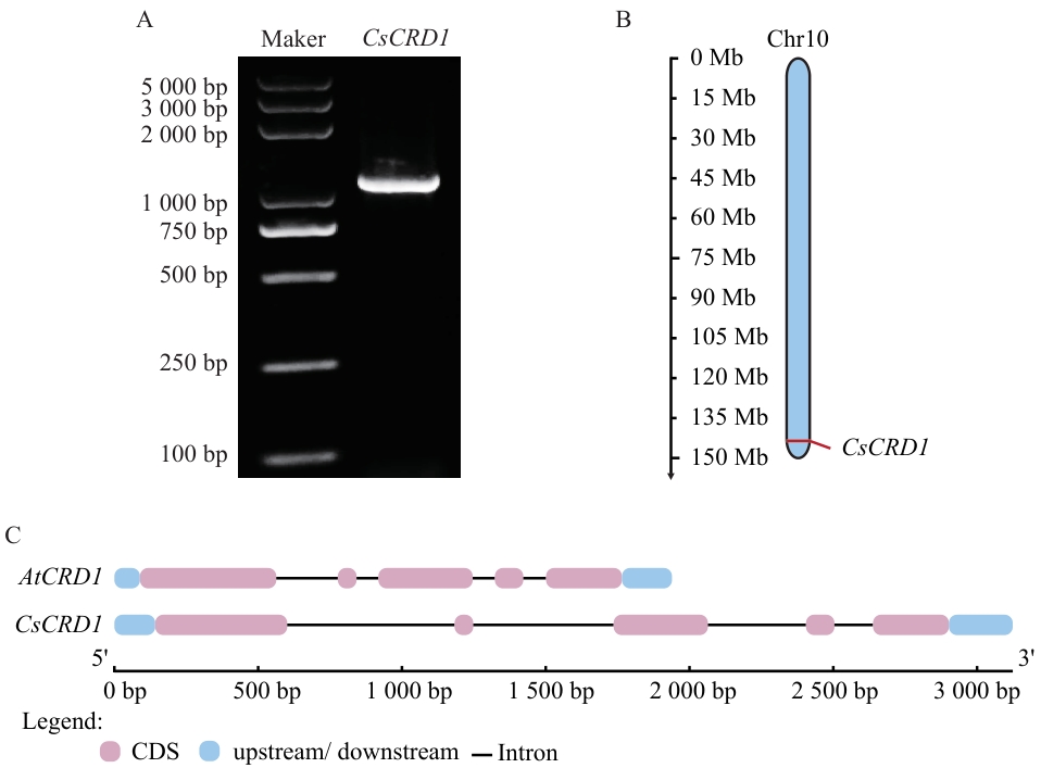 Fig. 1 Cloning and characterization analysis of CsCRD1 gene in tea plantA: Agarose gel electrophoresis image of the CsCRD1 gene. B: Chromosomal localization of CsCRD1 gene. C: Gene structural analysis of CsCRD1