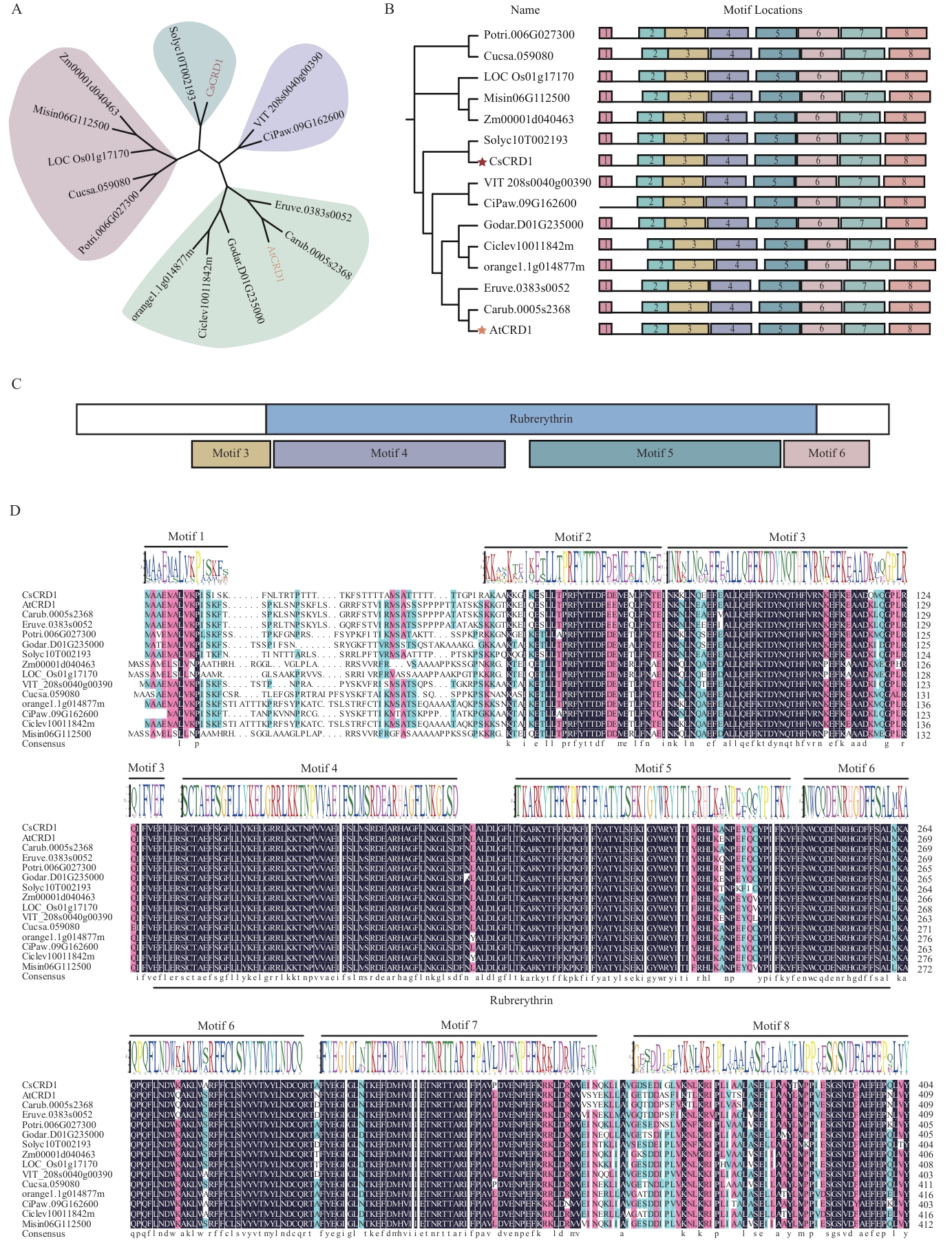 Fig. 2 Analysis of phylogenetic tree of CRD1 proteins and its sequence characteristics in plantA: Phylogenetic tree of CRD1 proteins in plant. The CRD1 homologous proteins used to construct the phylogenetic tree come from tea plant (Camellia sinensis, CsCRD1), Arabidopsis (Arabidopsis thaliana, AtCRD1), tomato (Solanum lycopersicum, Solyc10T002193), corn (Zea mays, Zm00001d040463), rice (Oryza sativa, LOC_Os02g46700), cotton (Gossypium darwinii, Godar.D01G235000), mustard (Brassica juncea, Carub.0005s2368), arugula (Eruca vesicaria, Eruve.0383s0052), poplar (Populus trichocarpa, Potri.006G027300), grape (Vitis vinifera, VIT_208s0040g00390), cucumber (Cucumis sativus, Cucsa.059080), sweet orange (Citrus sinensis, orange1.1g014877m), pecan (Carya illinoinensis Pawnee, CiPaw.09G162600), clementine (Citrus clementina, Ciclev10011842m), and Miscanthus (Miscanthus, Misin06G112500). B: Conserved motifs of CRD1 proteins in plant. C: The schematic representation for conserved structural domains of CRD1 proteins in plant. D: Amino acid multiple sequence alignment of CRD1 proteins in plant. Blue-black: Amino acid identity is 100%. Pink: Amino acid identity is 75%; blue: amino acid identity is 50%. ▬ indicates predicted the typical conserved domain Rubreythin of CRD1 protein in plants