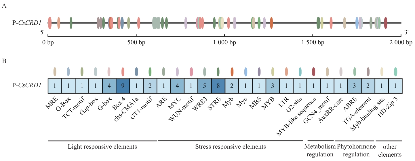 Fig. 3 Analysis of cis-acting elements in the promoters of gene CsCRD1 in tea plantA: Distribution of cis-acting elements in the promoter. B: Quantity of cis-acting elements in the promoter