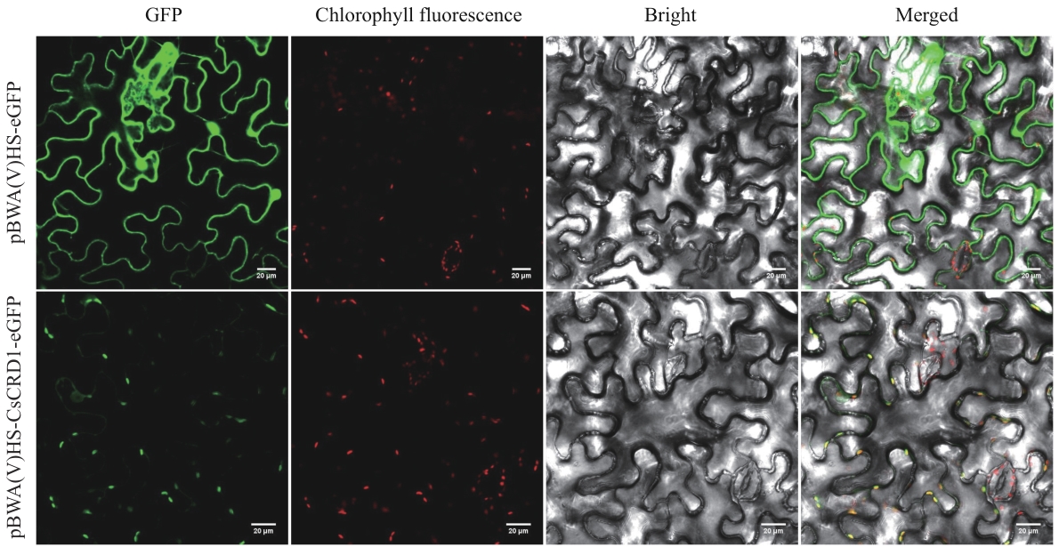 Fig. 4 Subcellular localization of CsCRD1 protein in tea plantGFP: Green fluorescent signal. Chlorophyll fluorescence: chloroplast autofluorescence. Bright: Bright field. Merged: Signal merge