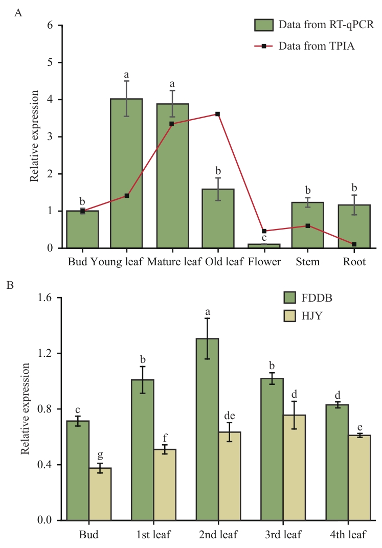 Fig. 5 Analysis of tissue-specific expression of CsCRD1 gene in tea plantA: Relative expression of the CsCRD1 gene in different tissues of the tea plant. B: Relative expression of the CsCRD1 gene in different leaf development stages of leaves from ‘Fudingdabaicha’ and ‘Huangjinye’. Different lowercase letters indicate significant differences at P<0.05 level (One-way ANOVA with Tukey’s post hoc test). The same below