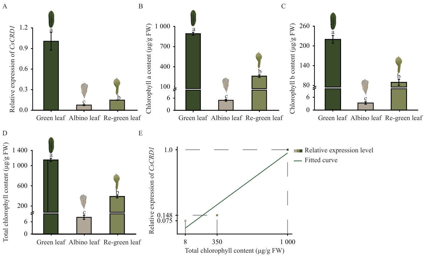 图6 茶树CsCRD1基因在叶色变化过程中的特异性表达分析A:CsCRD1基因的相对表达水平;B:叶绿素a含量;C:叶绿素b含量;D:叶绿素总量;E:叶绿素总量与CsCRD1基因相对表达水平的相关性分析