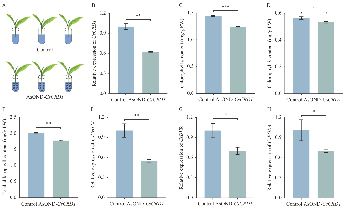 Fig. 8 Analysis of the impact of CsCRD1 gene silencing on chlorophyll biosynthesis in tea plantsA: Schematic diagram of CsCRD1 gene AsODN silencing. B: Relative expression of the CsCRD1 gene after AsODNs-CsCRD1 silencing. C‒E: Changes in chlorophyll content after CsCRD1 gene silencing. F‒H: Relative expressions of chlorophyll biosynthesis-related genes after CsCRD1 gene silencing. *, ** and *** indicate the significances of P<0.05, P<0.01, and P<0.001, respectively (one-way ANOVA with Tukey’s post hoc test)