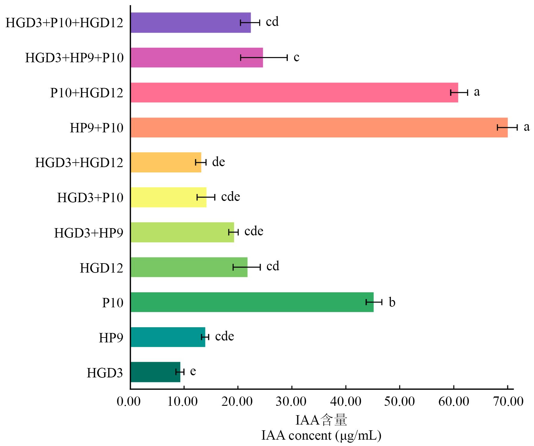 Fig. 1 IAA content in the co-fermented broth of different PGPR strainsLowercase letters indicate significant differences between treatment groups (P<0.05)