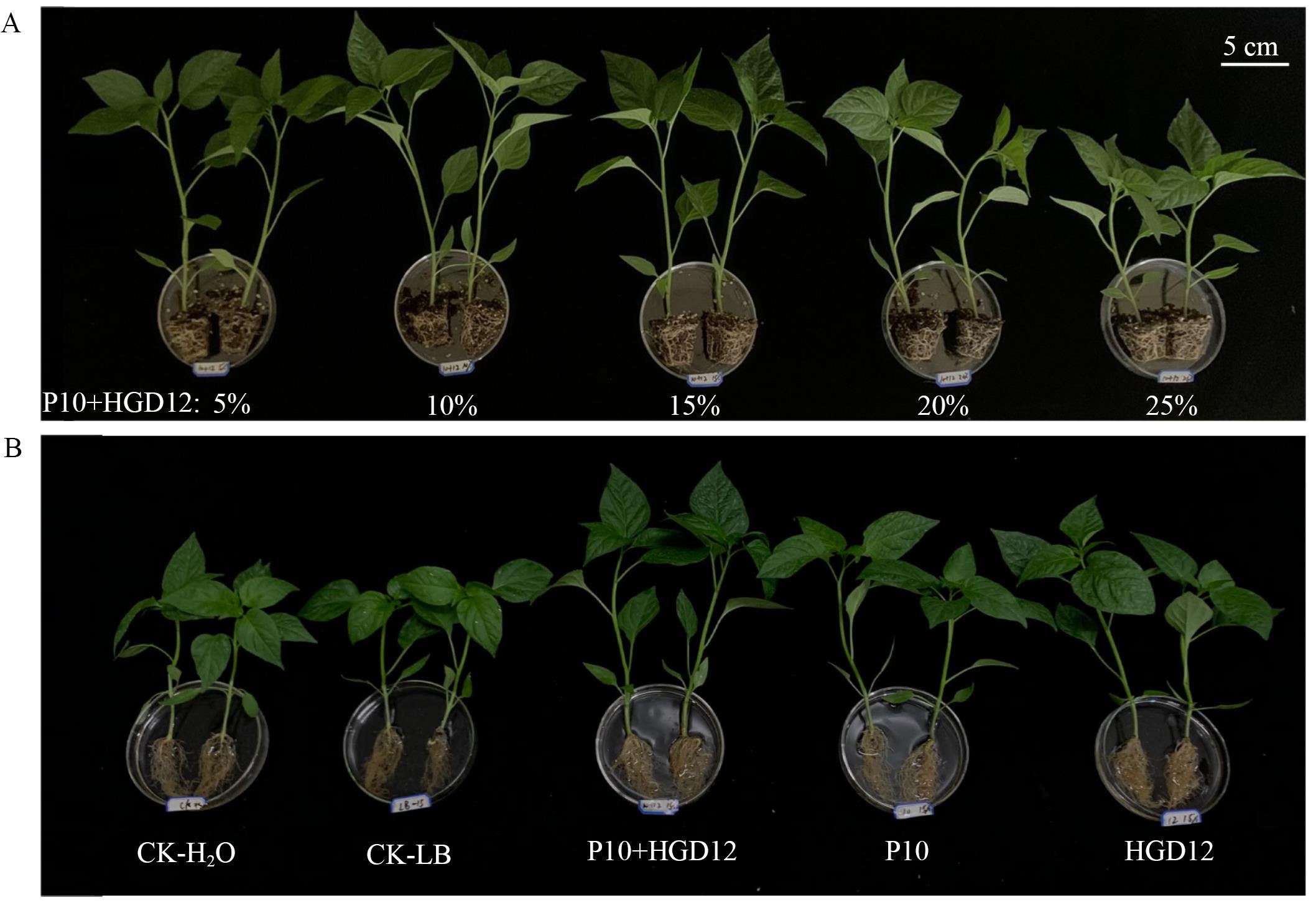 Fig. 2 Growth of pepper seedlings on the bio-nursery substrate using hole trayA: Seedling growth on substrates with different concentration of co-fermented broth. B: Seedling on substrates treated with fermented broth from different strains at a 15% inoculation ratio. 5%, 10%, 15%, 20% and 25% refers to the treatment group with different concentrations of P10+HGD12. CK-H2O and CK-LB is the control with water and the control with 15% LB, respectively. P10+HGD12, P10 and HGD12 refers to the treatment group with 15% P10+HGD12 co-fermented broth, P10 broth and HGD12 broth, respectively