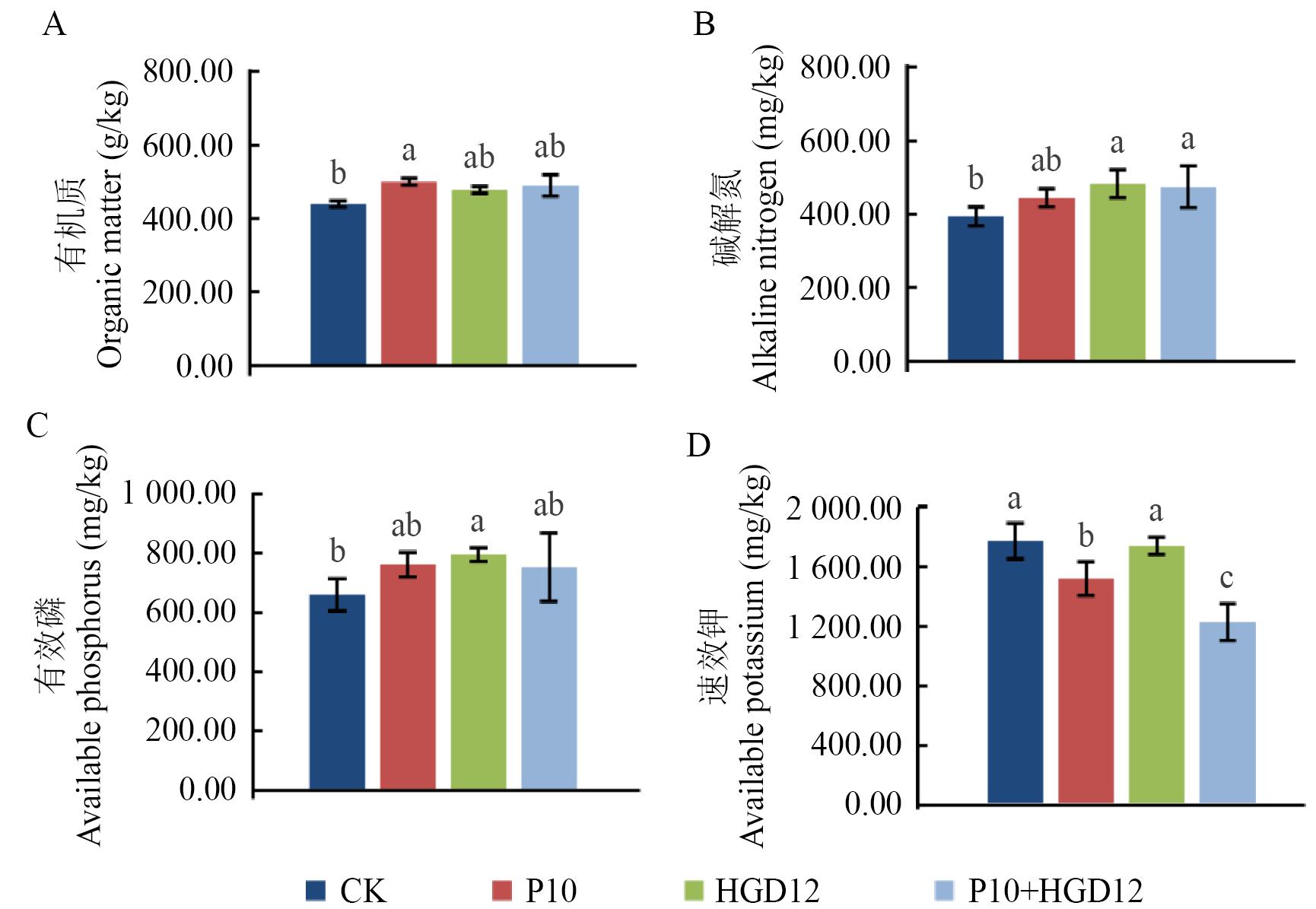 Fig. 3 Nutrient content of nursery substrate under different treatmentsP10, HGD12, and P10+HGD12 indicates the 15% proportion of fermented broth added to the nursery substrate, respectively; CK is the control with water. Lowercase letter indicates the significant differences of each index between these four treatments (P<0.05), respectively